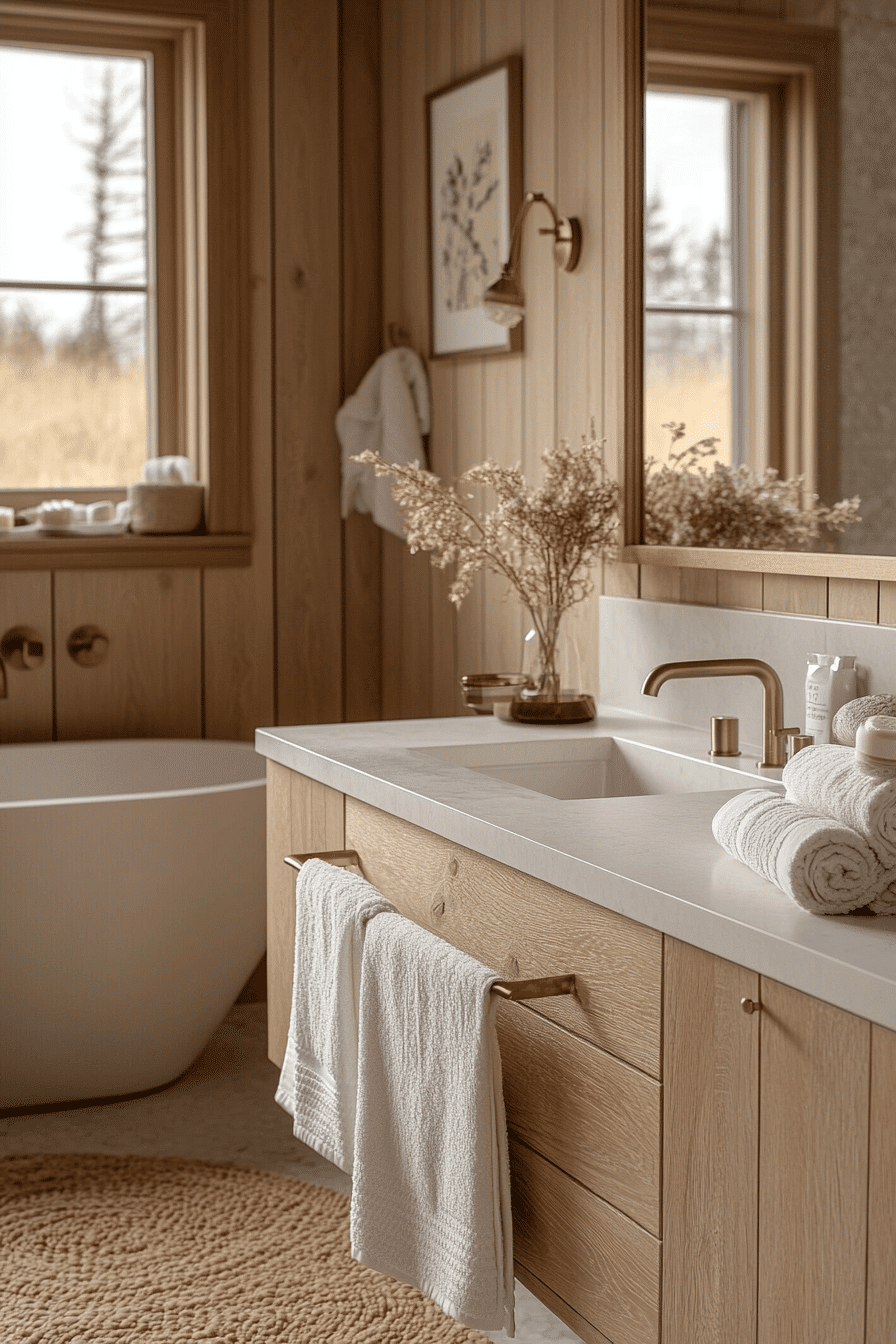 Incorporating wood details into a cozy bathroom adds warmth and natural beauty. The grain introduces texture that feels organic and timeless. Paired with soft lighting, the space becomes even more inviting. Creamy tones help balance the richness of the wood. The overall design feels grounded and peaceful. Add wood elements for a cozy touch.