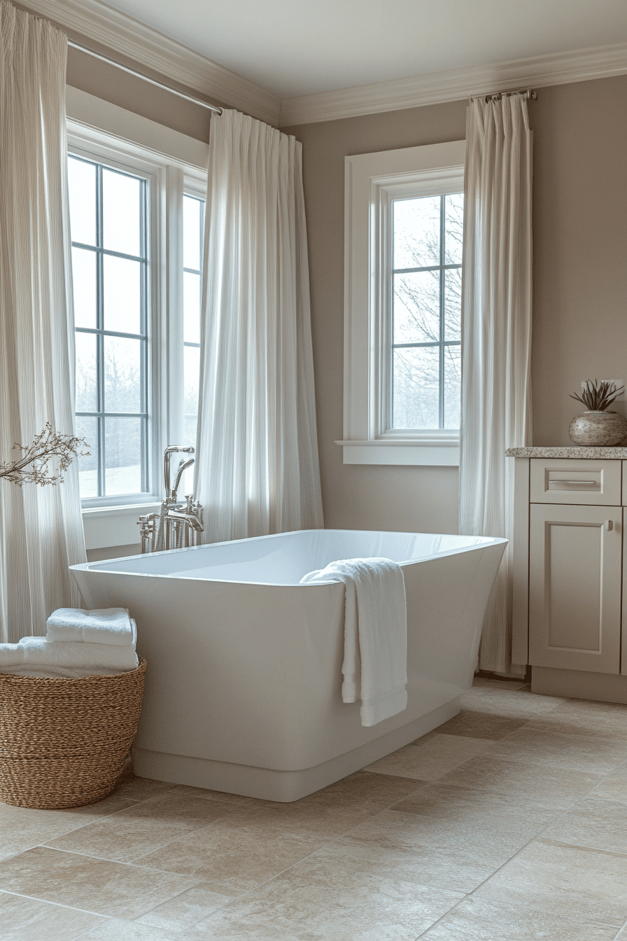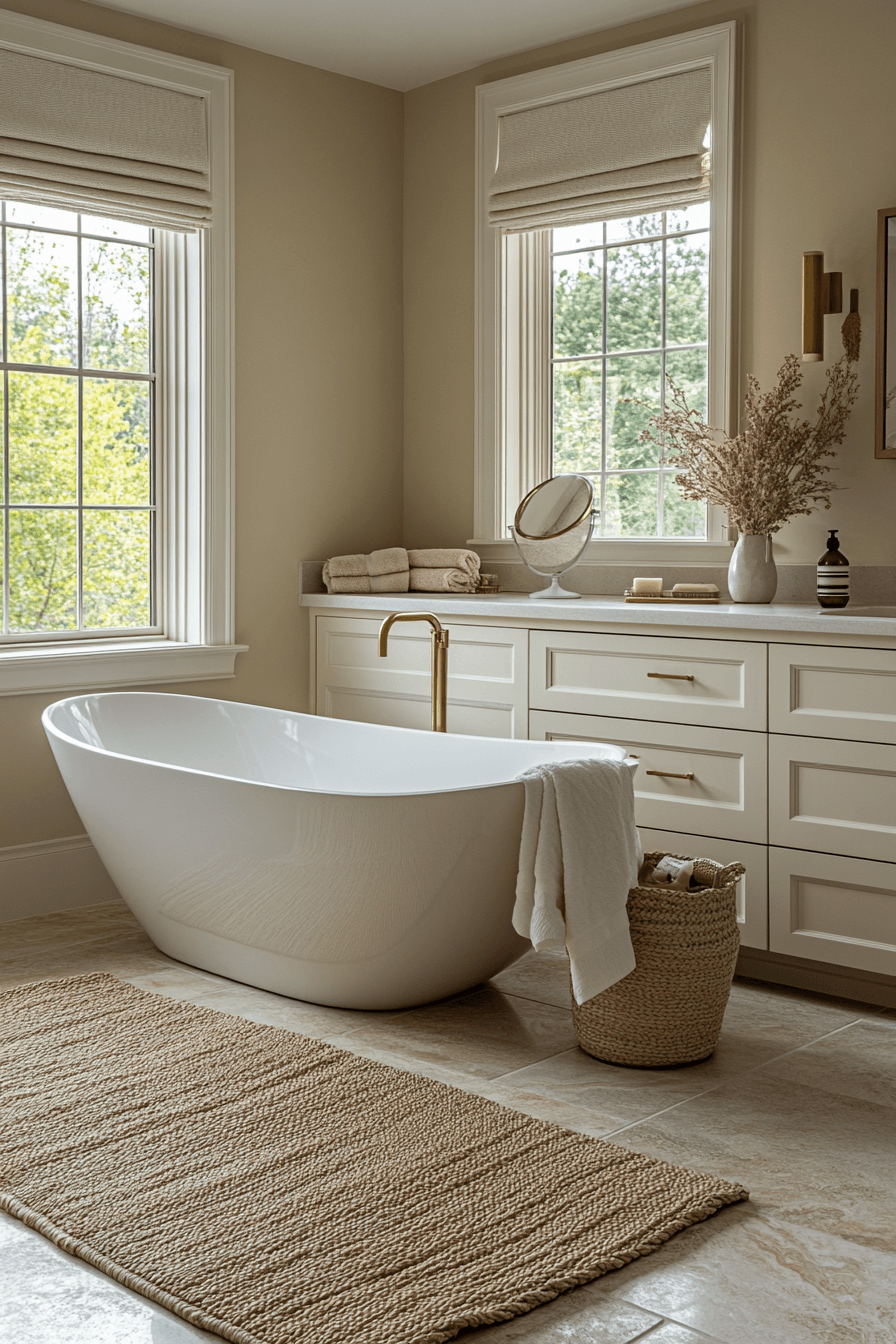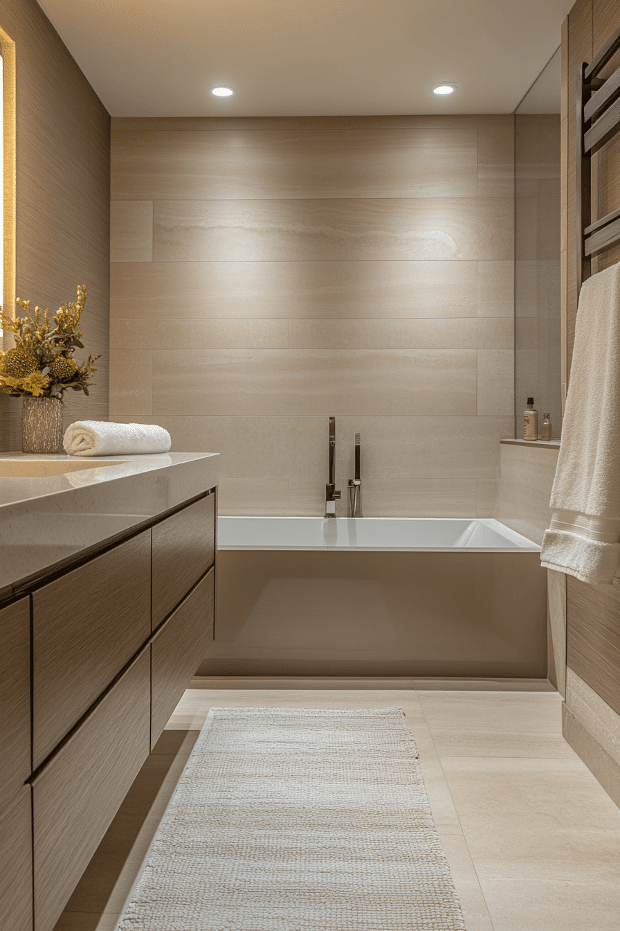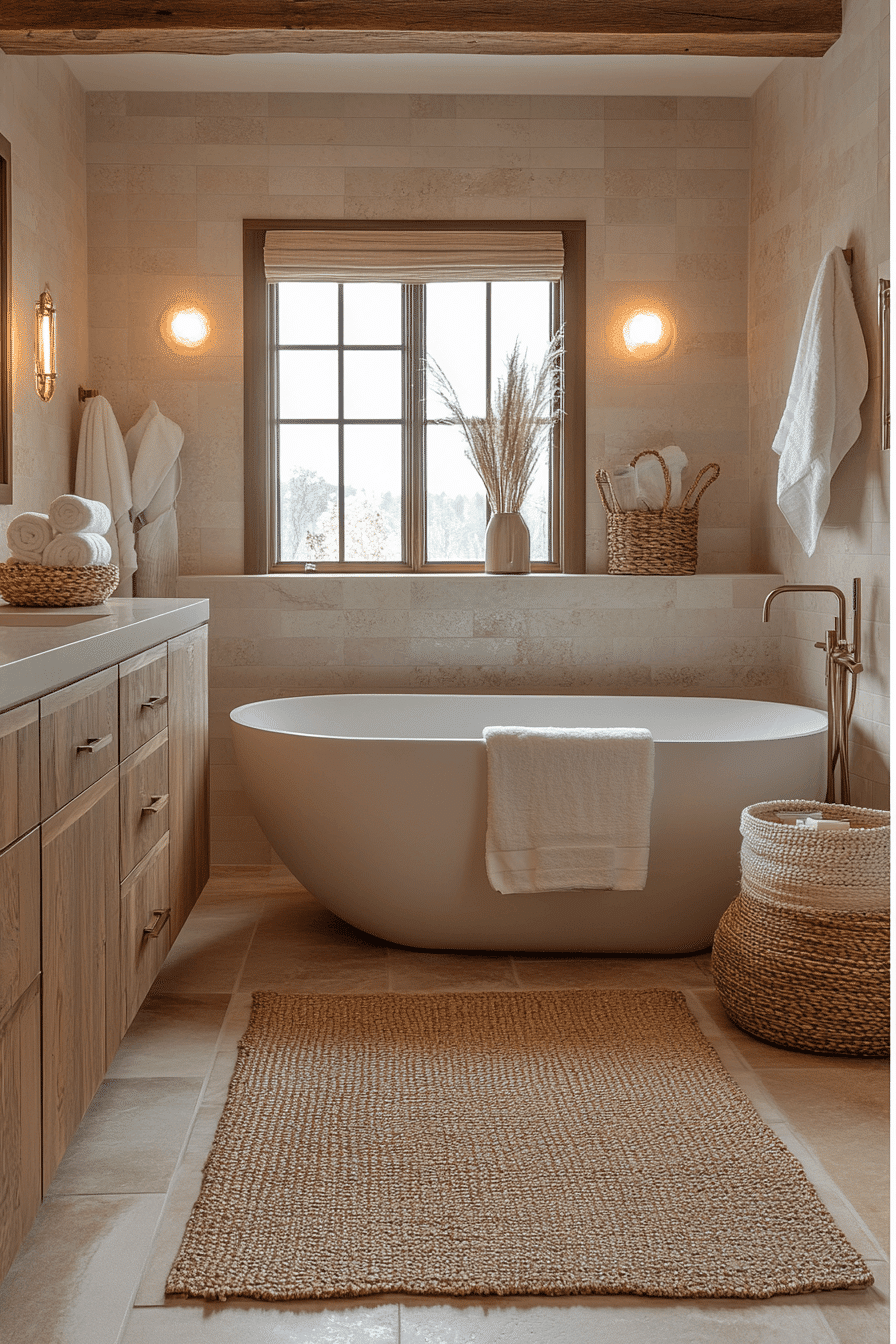 Walking into this cozy bathroom instantly shifts your mood into something calm and comforting. Warm neutral tones wrap the space in softness while keeping everything light and airy. Plush textiles and smooth finishes add a touch of modern elegance without losing that inviting feel. Subtle wood and stone accents bring in natural texture that feels grounded and serene. The entire design feels balanced, effortless, and quietly luxurious. Refresh your space with this calming bathroom style.