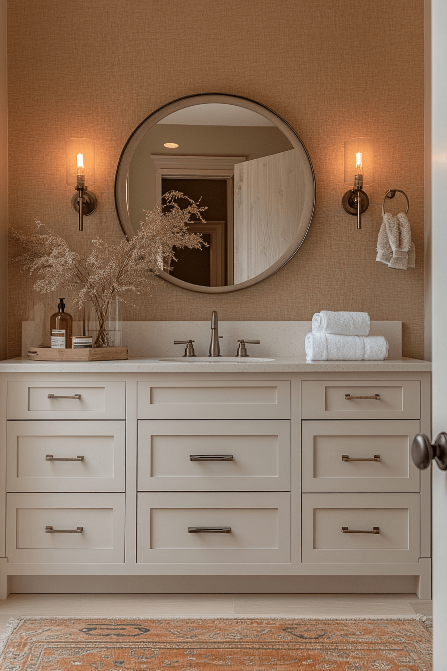 A powder room can easily become a cozy bathroom with a few intentional updates. Warm paint colors create an inviting foundation. Layered lighting adds depth and enhances the mood. Mirrors and textured accents bring personality to the space. The compact size makes everything feel more intimate. Redesign your powder room with these ideas.