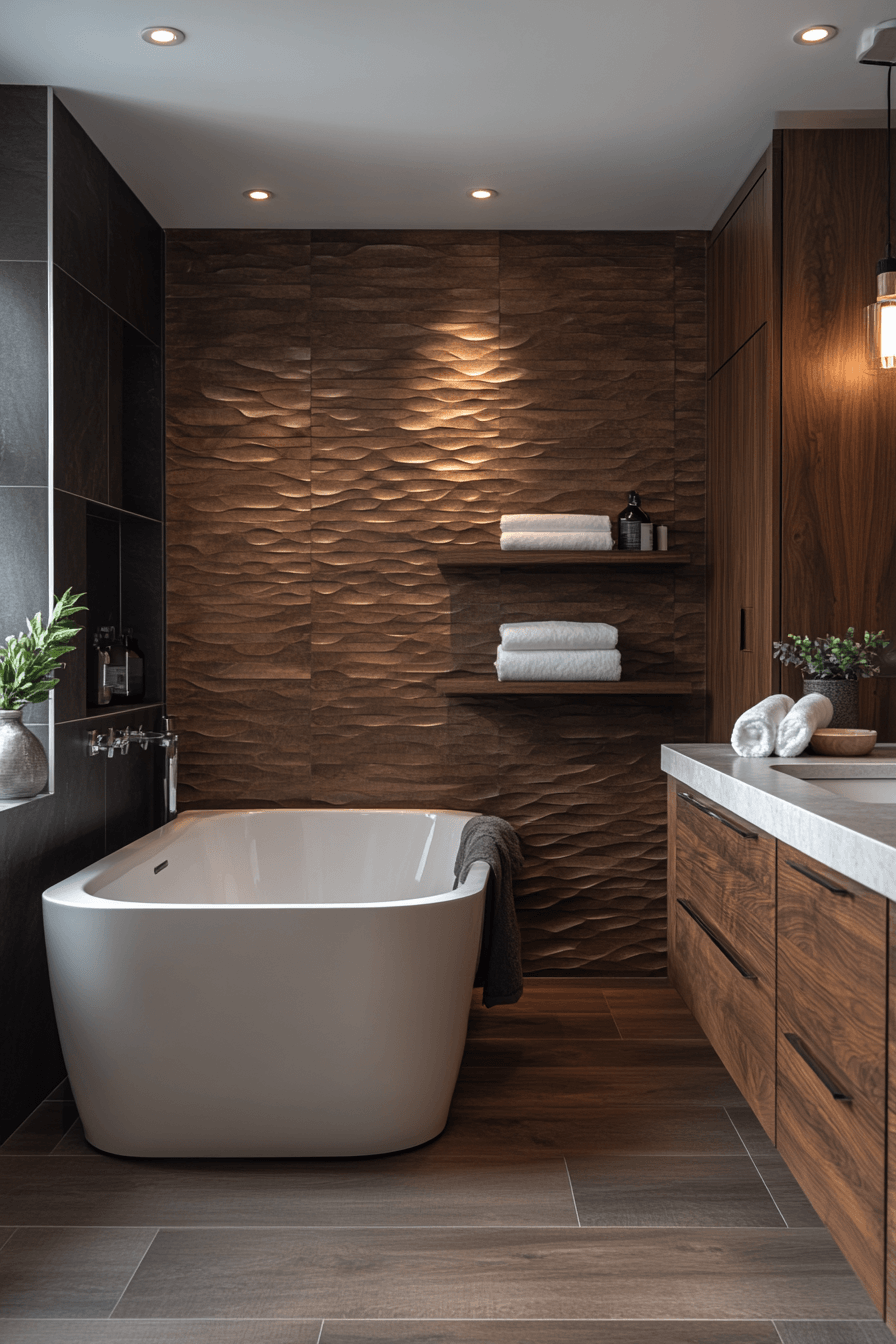 Deep colors paired with soft fabrics create a cozy bathroom that feels both bold and inviting. Rich browns and warm neutrals encourage relaxation. Plush textures soften the overall design. Lighting enhances the depth of the colors beautifully. The space feels indulgent yet approachable. Try this rich and cozy design style.