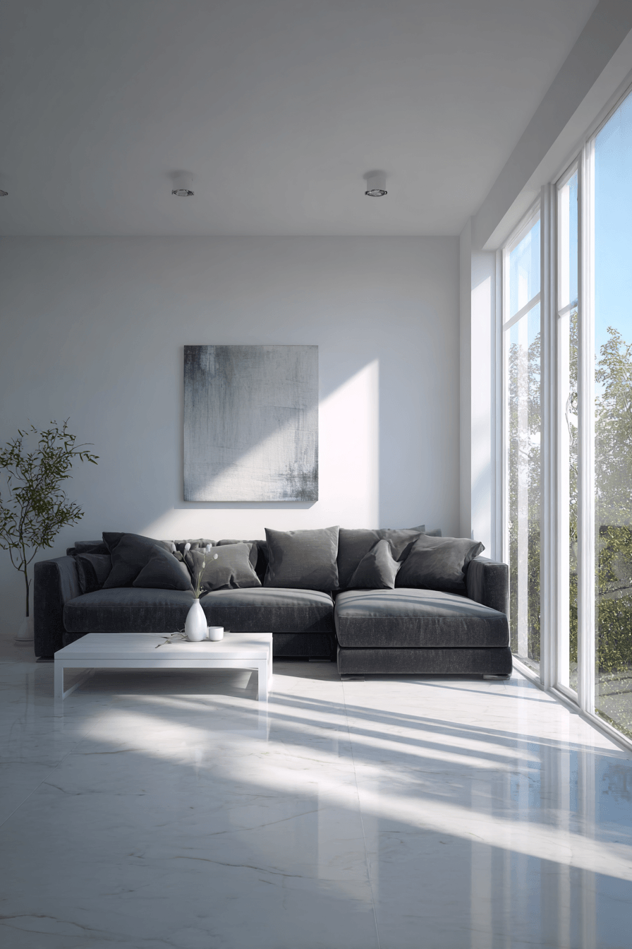 A clean, minimalist setup highlights a dark grey sofa living room that feels refined, calm, and easy to live in. Bright walls and subtle grey accents create a fresh backdrop that lets the sofa stand out. Open space keeps the room feeling airy and uncluttered. Small black or metallic details add contrast without overwhelming the design. The overall look feels polished yet comfortable. Refresh your space with this simple modern approach.