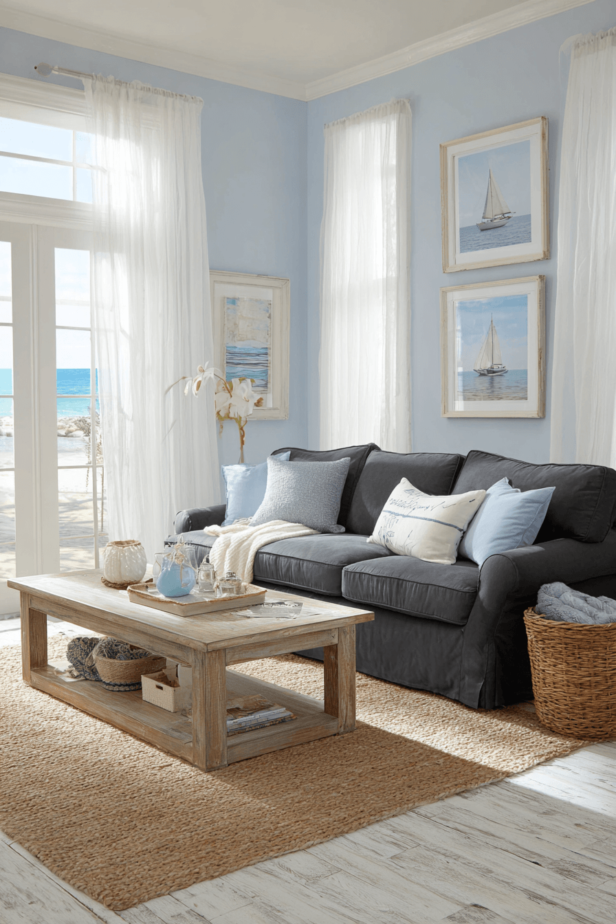 Coastal inspiration brings a relaxed feel to a dark grey sofa living room with light and airy touches. Soft blues and sandy tones balance the richness of the sofa. Linen fabrics and natural elements add freshness. The space feels calm and breezy. It’s perfect for a laid-back atmosphere. Bring coastal comfort into your home.