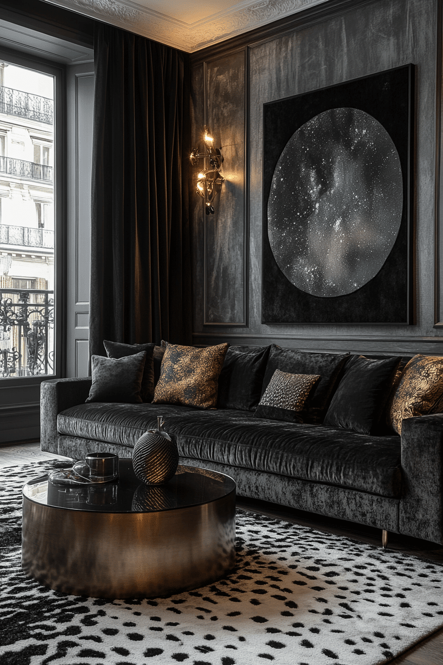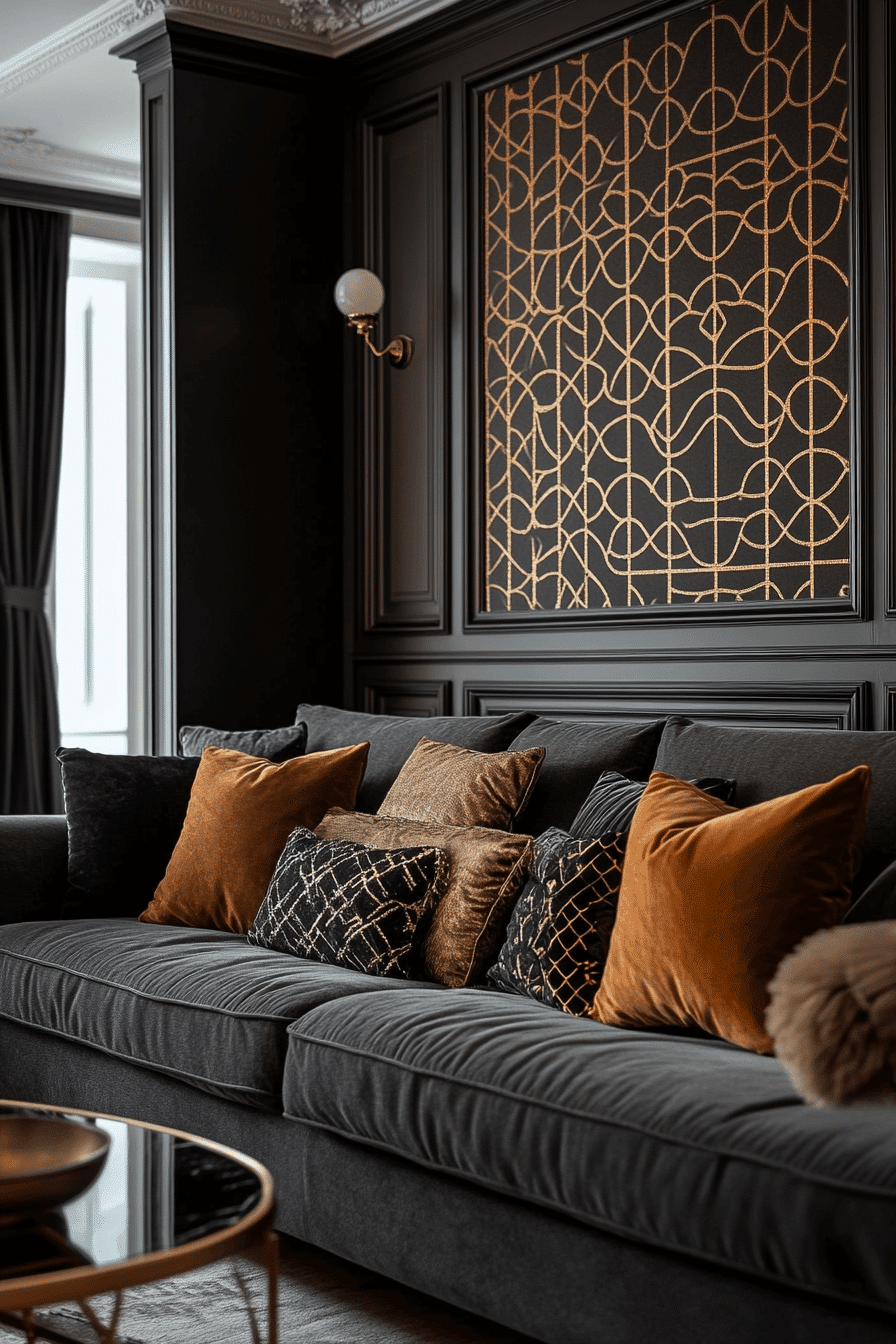 Art Deco influence adds elegance to a dark grey sofa living room with bold patterns and luxurious materials. Metallic finishes and velvet textures create a rich aesthetic. The sofa anchors the design among statement accents. Every detail feels polished and intentional. The space feels glamorous yet inviting. Add timeless elegance to your room.
