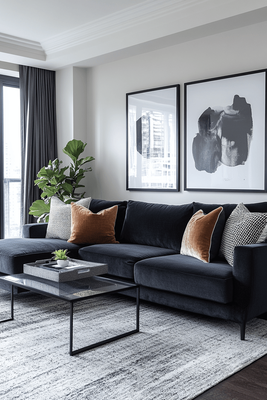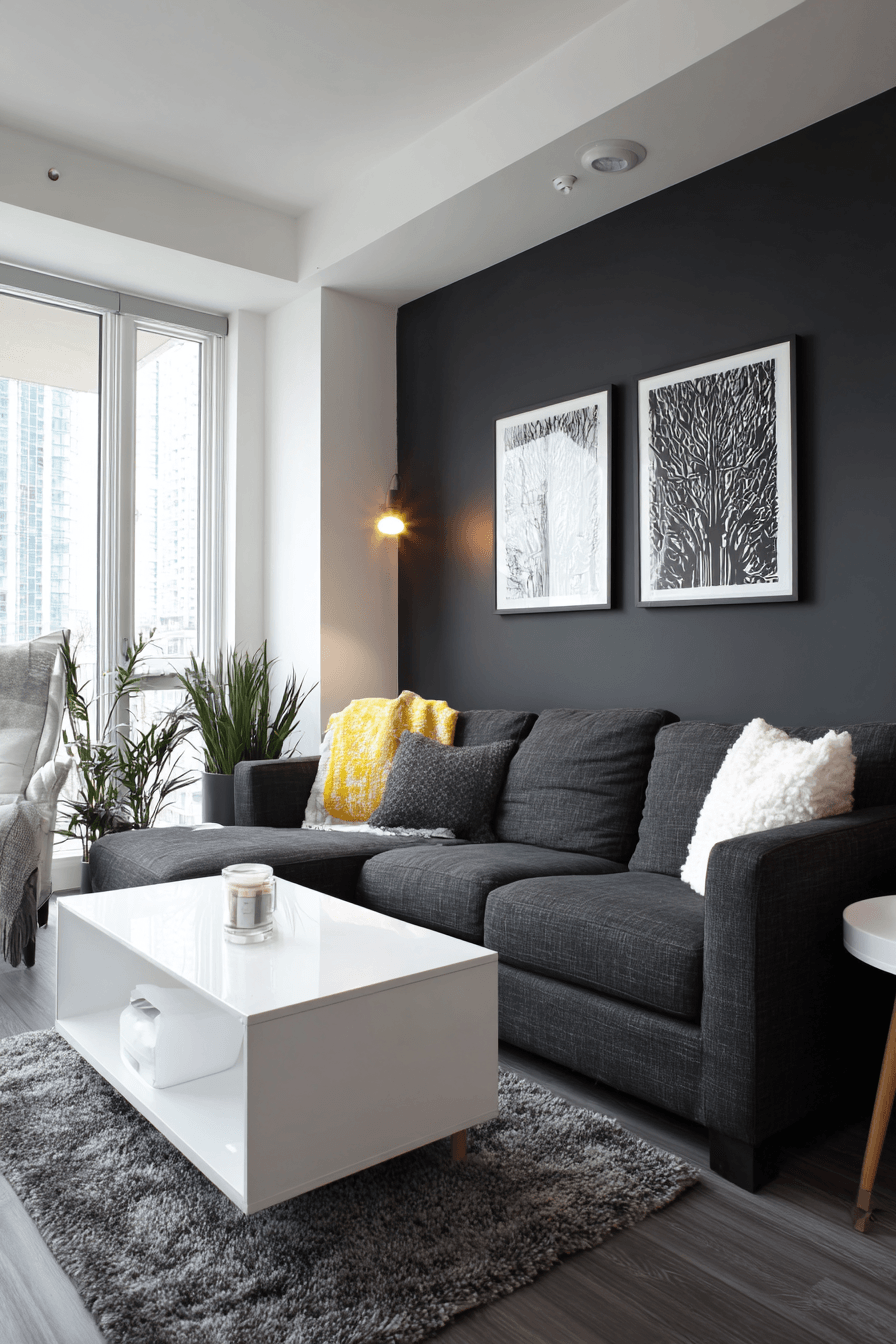 Contemporary contrast brings bold energy into a dark grey sofa living room with clean lines and sharp design. Bright walls and dark accents create striking balance. Sleek furniture enhances the modern feel. The space feels structured yet inviting. Every detail feels purposeful. Embrace contemporary style.