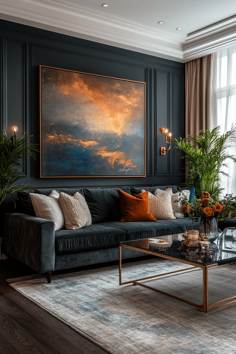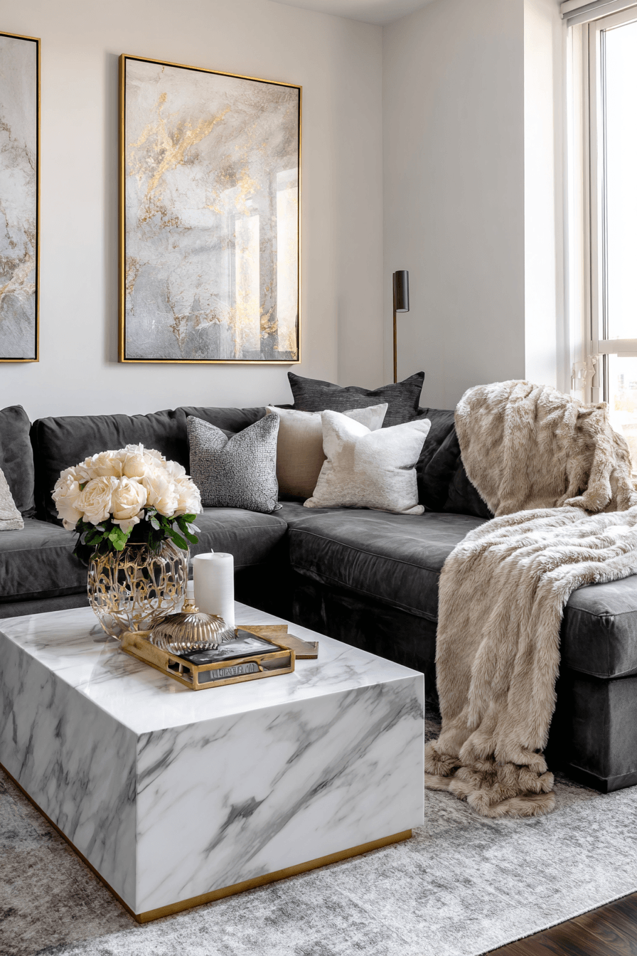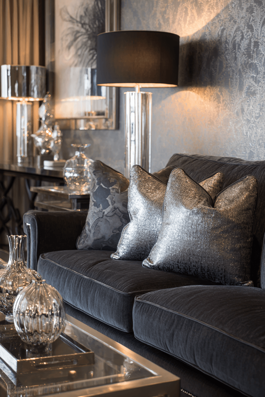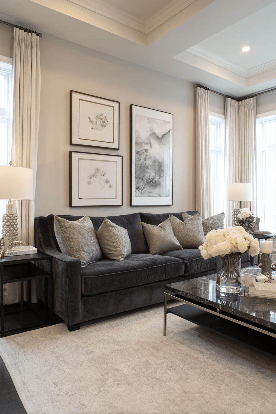 Metallic finishes elevate a dark grey sofa living room with a sleek and polished feel. Chrome and gold accents reflect light and add dimension. The richness of the sofa pairs beautifully with these elements. Minimal decor keeps the space balanced. The overall look feels modern and refined. Add a touch of shine to your space.