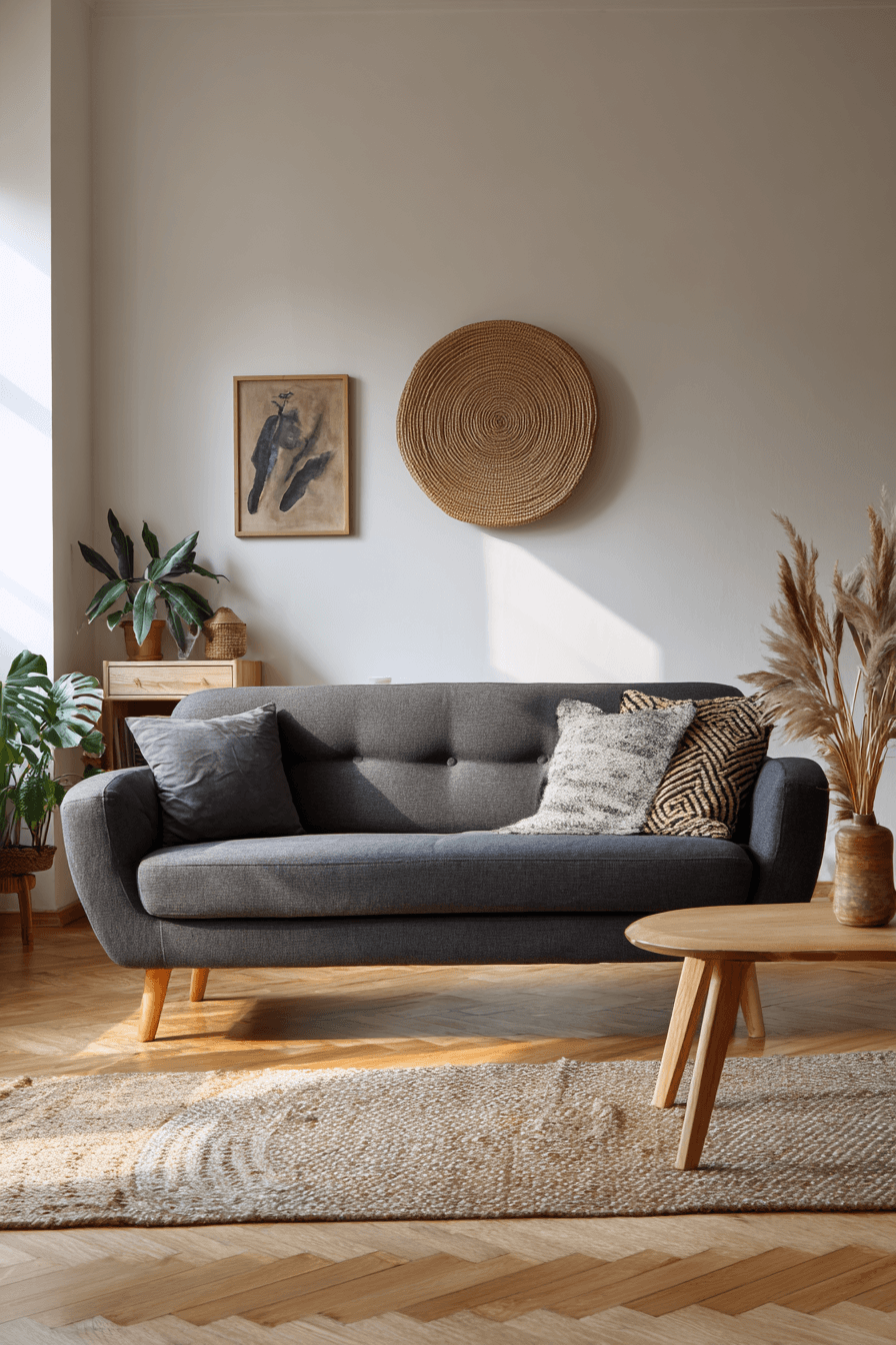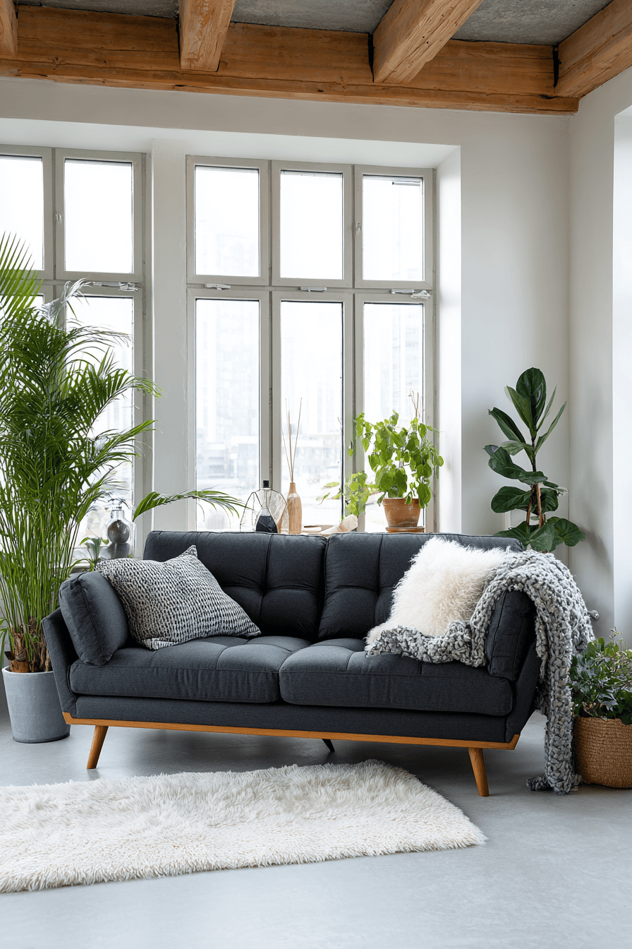 Scandinavian influence shapes a dark grey sofa living room into a cozy and practical retreat. Light wood and white walls brighten the space while the sofa adds depth. Soft throws and rugs create warmth and comfort. Each piece serves a purpose, keeping the design simple and clean. The result feels both functional and inviting. Create a cozy Scandinavian-inspired space.