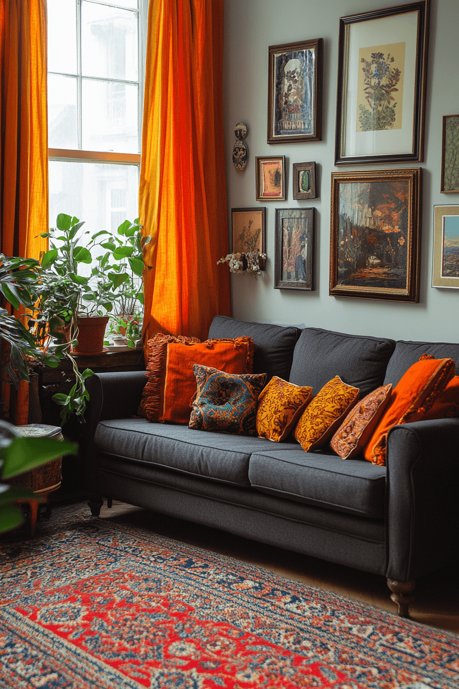 Eclectic styling adds personality to a dark grey sofa living room with a mix of influences. Vintage finds and modern accents create a curated look. Bold patterns and colorful decor bring life into the space. Each piece feels meaningful and unique. The result is creative and inviting. Express your style through eclectic design.