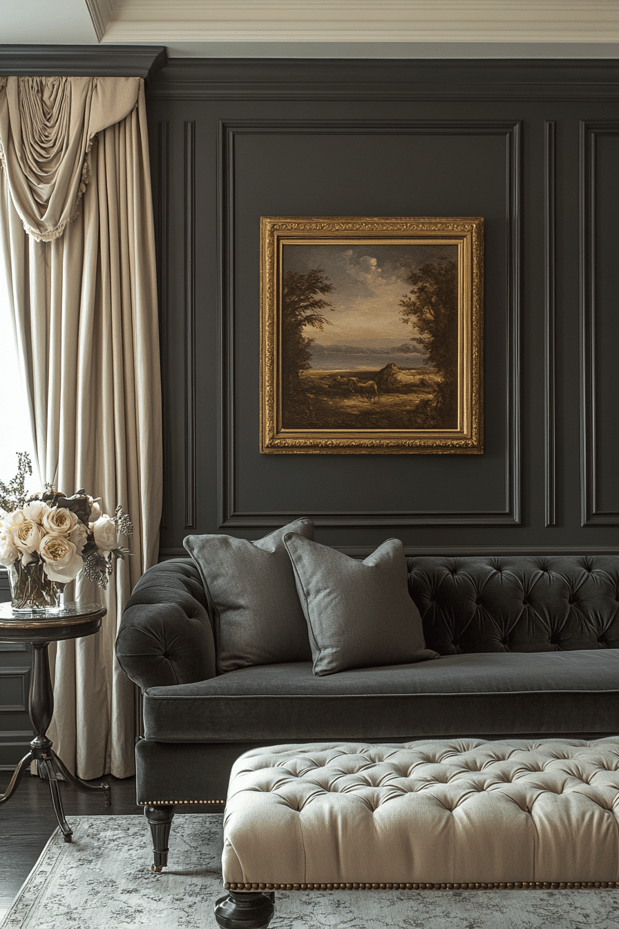 Neo-classical inspiration shapes a dark grey sofa living room into a refined and timeless space. Architectural details and elegant decor add structure. Modern elements keep the look fresh. The sofa blends seamlessly with classic touches. The design feels balanced and polished. Add graceful elegance to your space.