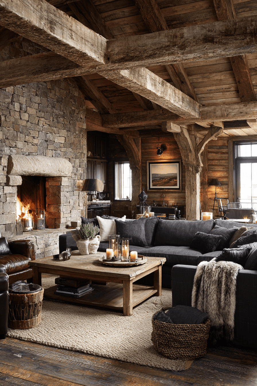 Rustic elements bring warmth into a dark grey sofa living room with natural textures and earthy tones. Reclaimed wood and stone details add depth. Soft fabrics enhance the cozy atmosphere. The grey sofa balances the warmth beautifully. The space feels grounded and inviting. Create a rustic-inspired retreat.