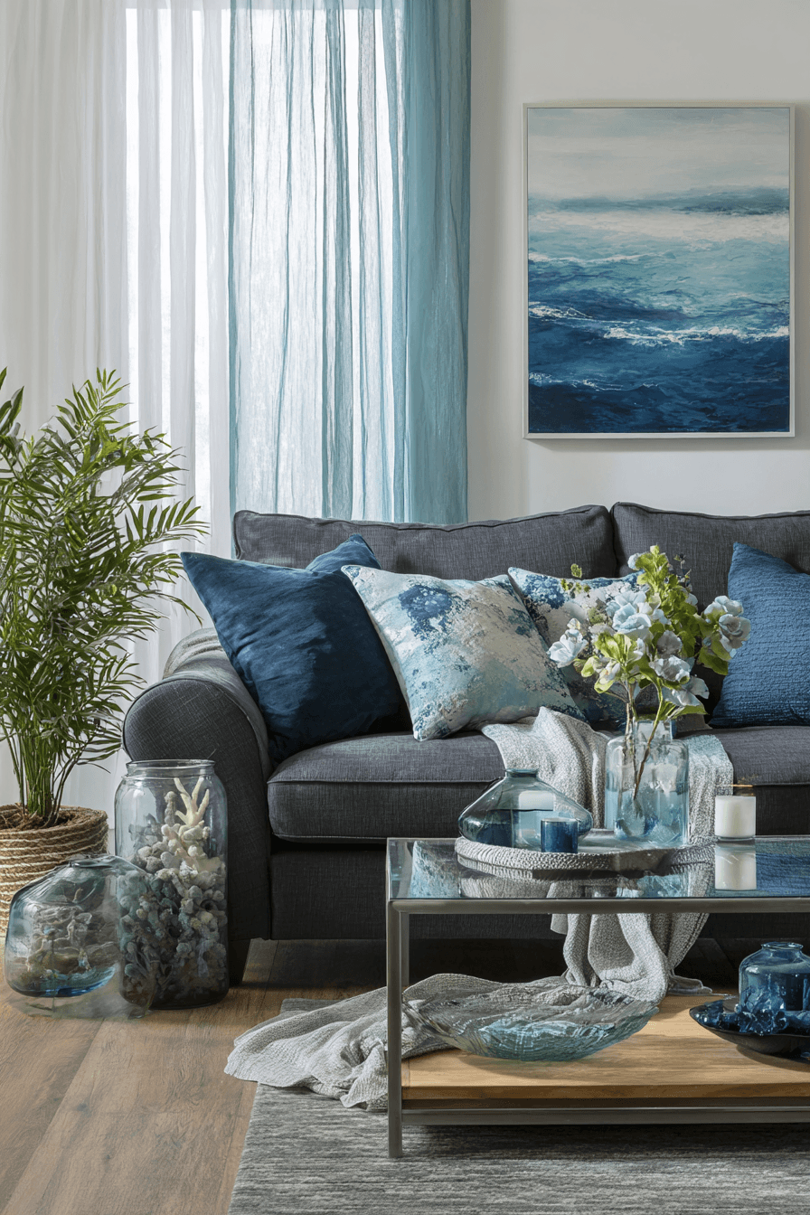 Ocean-inspired tones refresh a dark grey sofa living room with a light and calming vibe. Blues and greens complement the richness of the sofa. Airy fabrics keep the space feeling open. Natural elements add texture and depth. The design feels relaxed and fresh. Bring ocean-inspired style into your home.