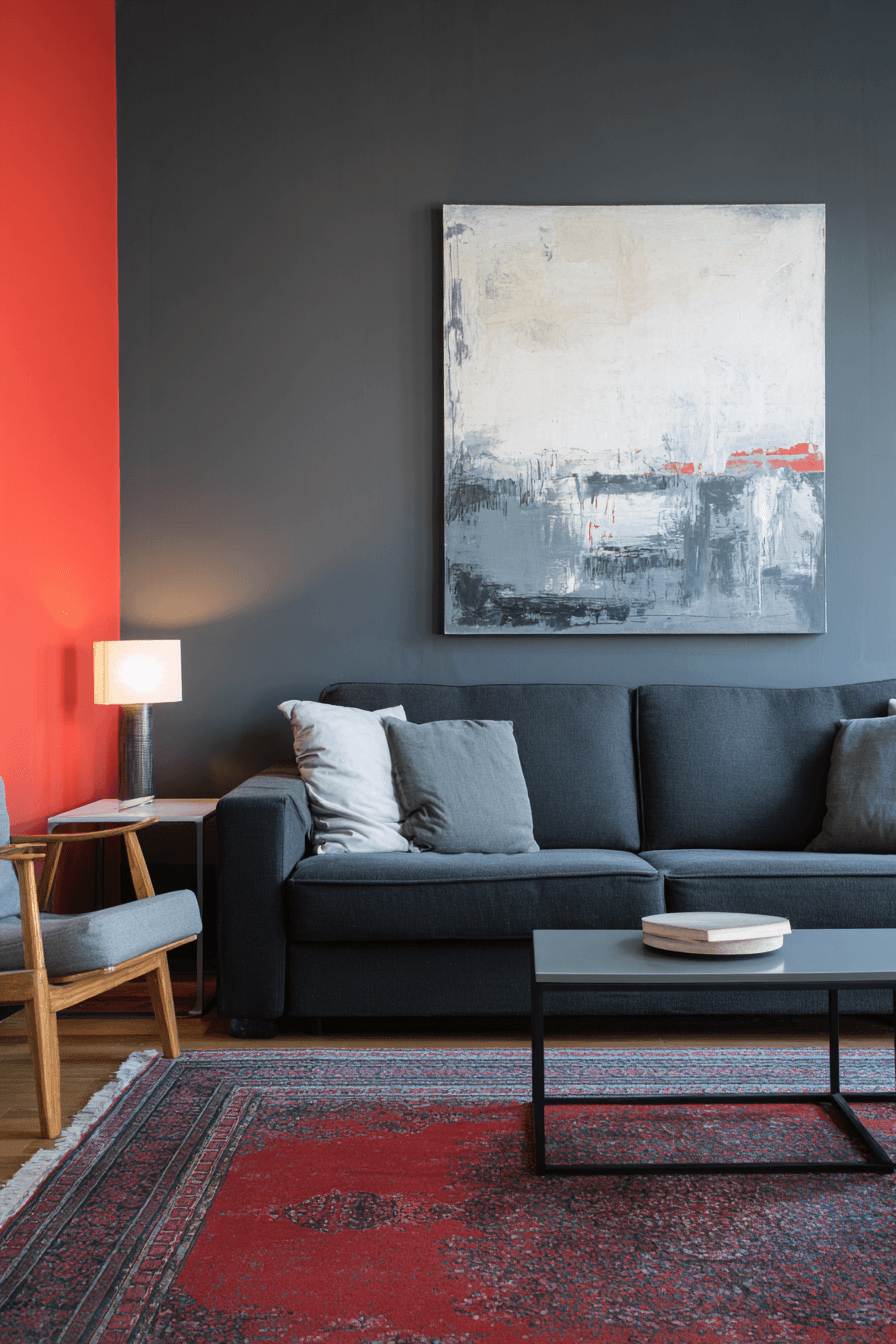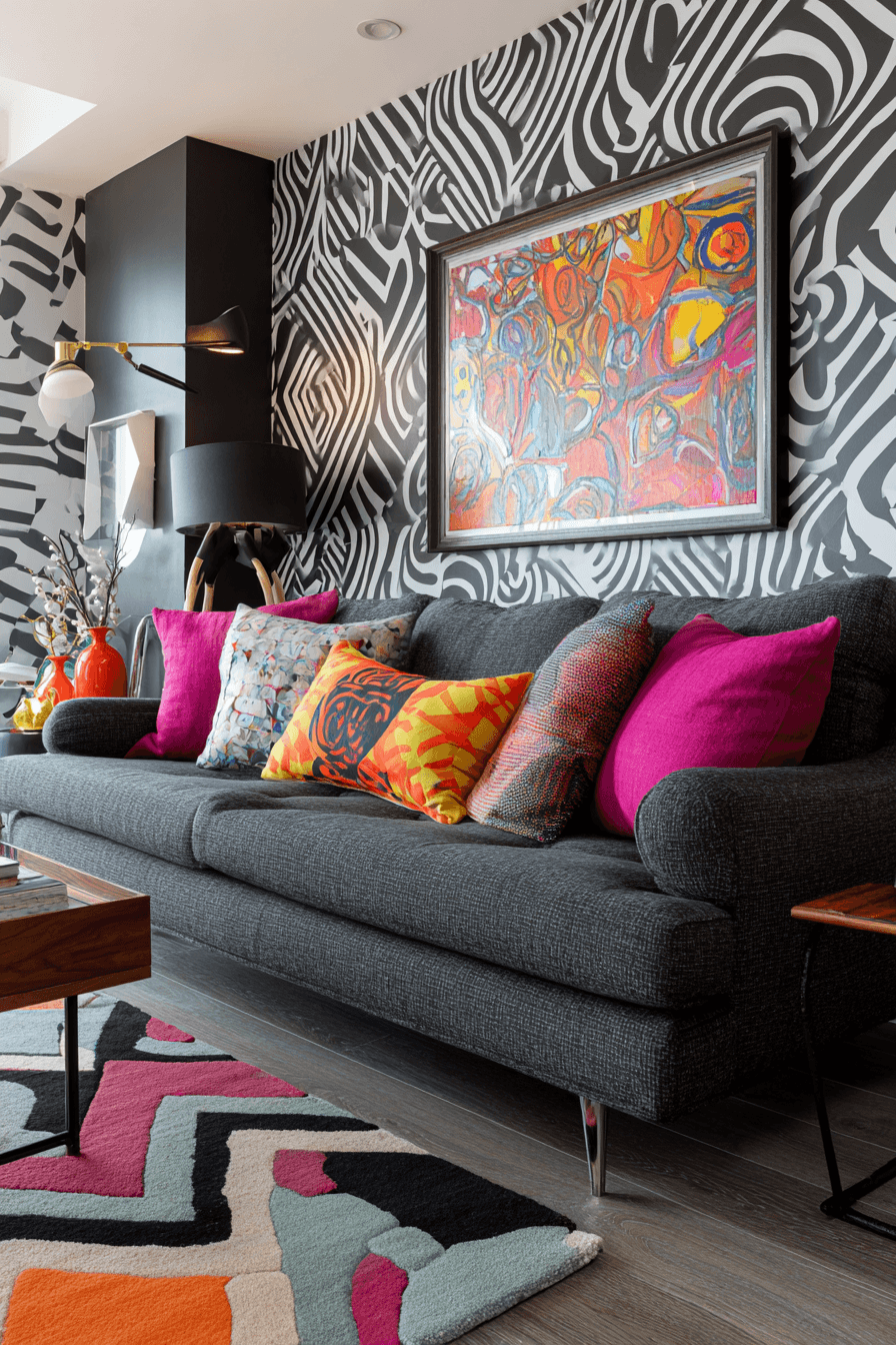 Vibrant design choices make a dark grey sofa living room feel bold and full of life. Bright artwork and playful decor bring energy into the space. Geometric patterns and sculptural lighting add movement. Every detail feels expressive and intentional. The sofa anchors the look beautifully. Create a space that stands out.