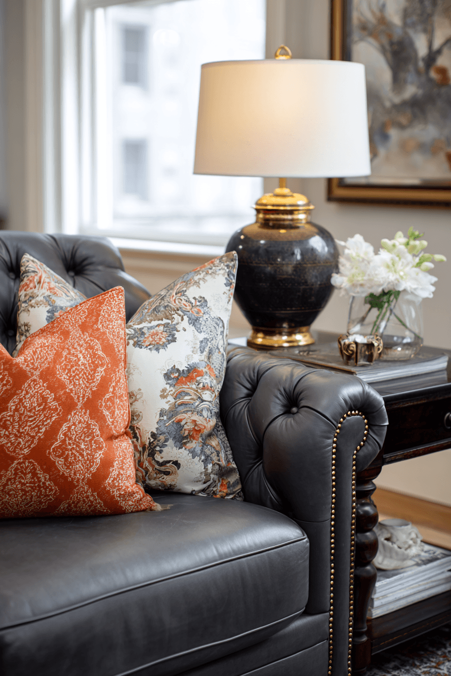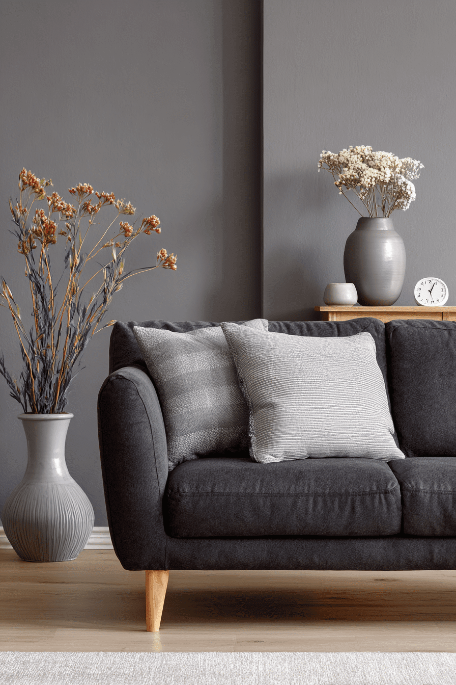 High contrast styling gives a dark grey sofa living room a bold and modern edge. Light walls allow the sofa to stand out beautifully. Pops of color add energy and personality. The design feels sharp and intentional. It’s perfect for creating visual impact. Explore contrast-driven styling.