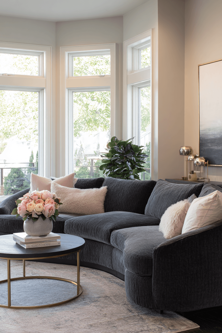 Soft modern styling creates a dark grey sofa living room that feels warm and inviting. Rounded furniture and gentle lighting soften the design. Natural textures add depth and comfort. The sofa grounds the space beautifully. The result feels balanced and cozy. Bring softness into modern design.