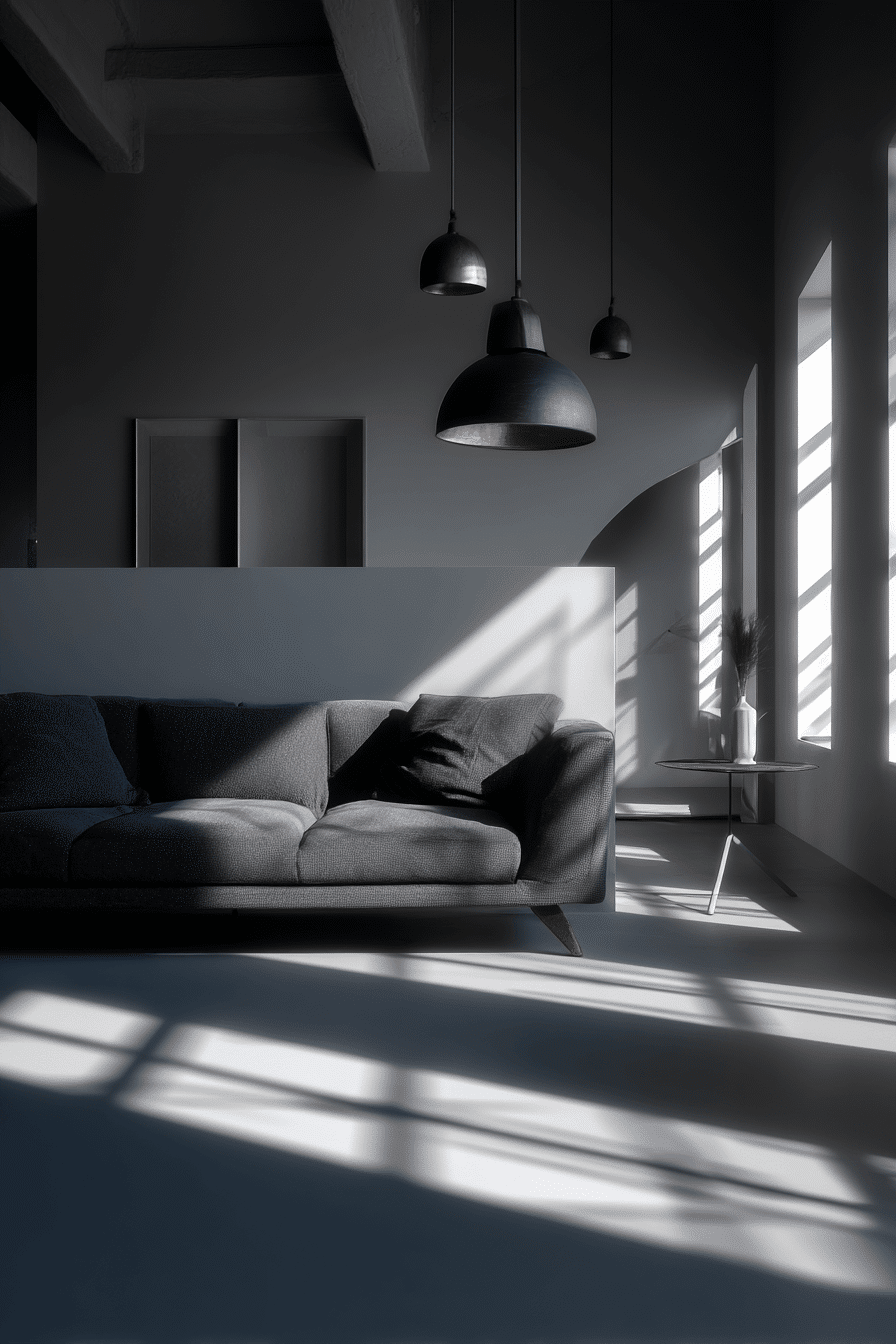 Minimalist maximalist styling creates a bold yet balanced dark grey sofa living room. Clean layouts allow statement pieces to shine. Dramatic decor adds personality without clutter. The sofa anchors the design. The space feels intentional and stylish. Redefine your space with bold simplicity.