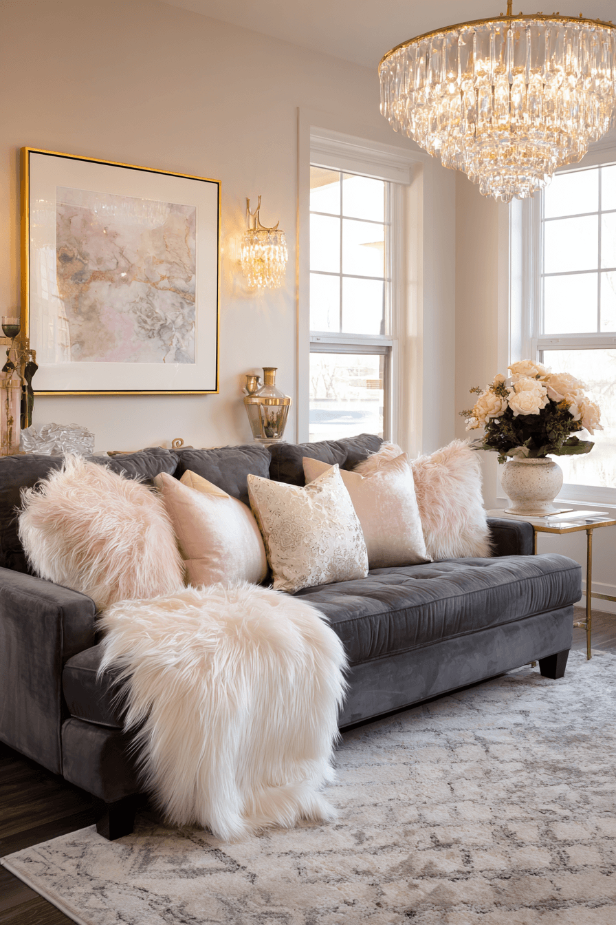 A soft, romantic approach creates a dark grey sofa living room filled with warmth and charm. Plush pillows and flowing fabrics soften the overall look. Warm lighting adds a gentle glow throughout the space. Pastel accents bring subtle contrast. The room feels cozy and elegant. Add a dreamy touch to your living space.