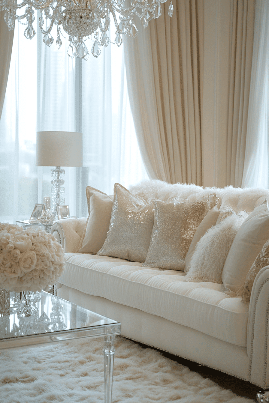 Transparent accents introduce a modern sparkle into an elegant living room design while keeping it light. Acrylic or glass elements maintain openness. These details pair well with plush textures. The look feels refined and uncluttered. Subtle shine enhances elegance. Add transparency for a modern touch.