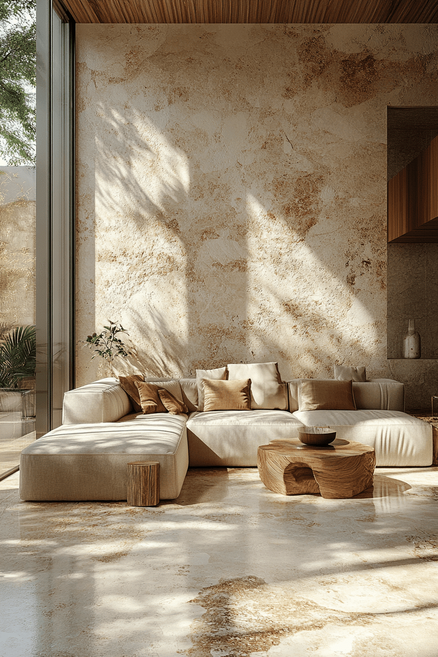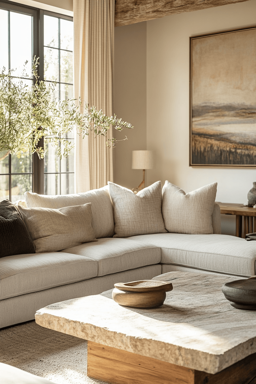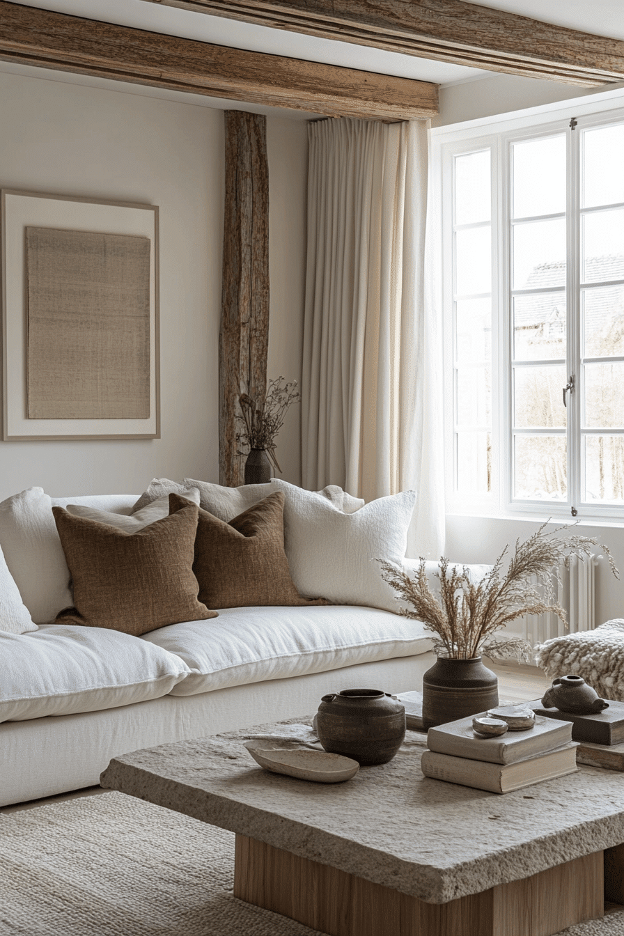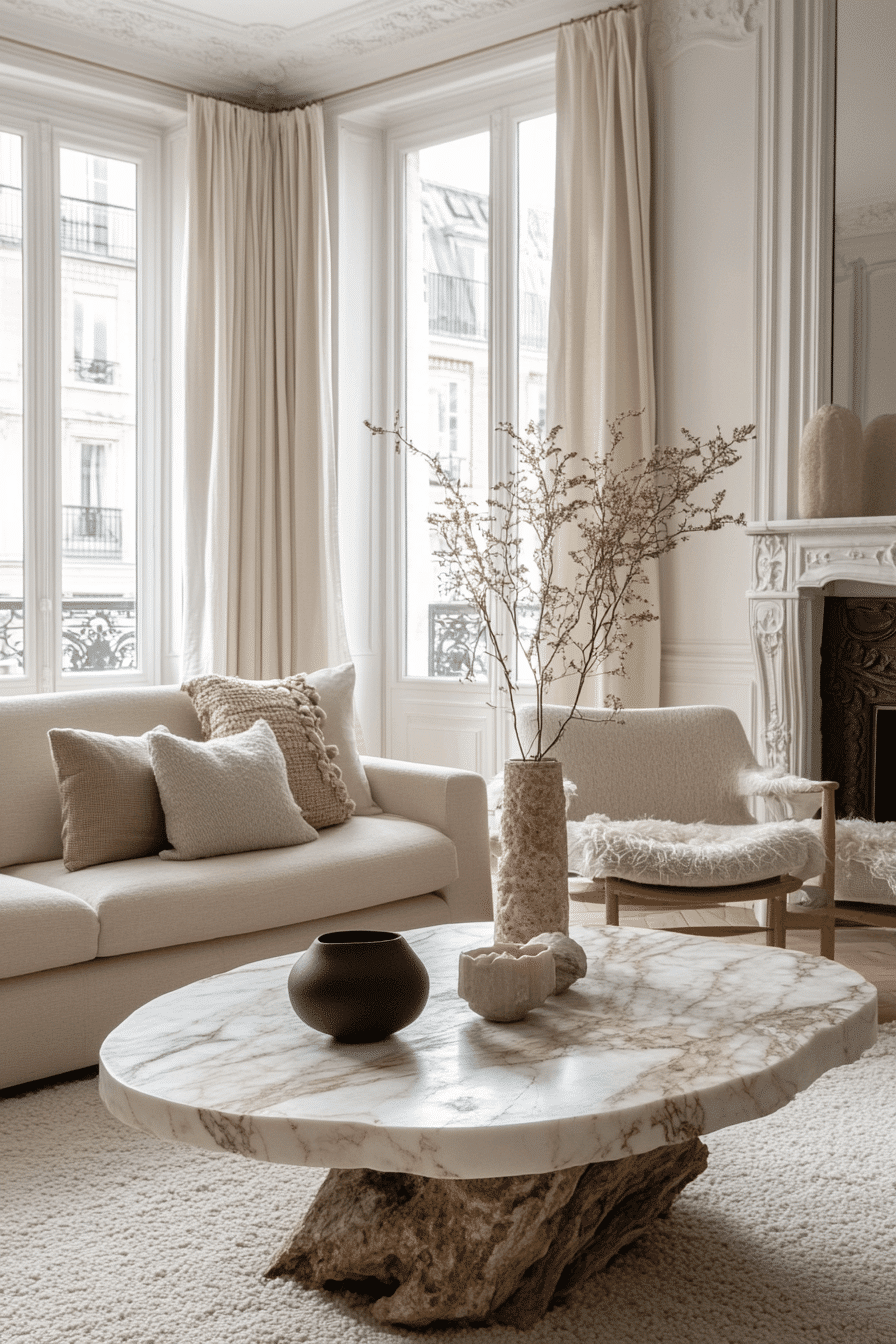 Natural materials bring grounding beauty into an elegant living room design with texture and calm movement. Stone and wood elements add depth. Soft fabrics balance the look. The palette feels cohesive and warm. The space feels peaceful and refined. Introduce natural elements for harmony.