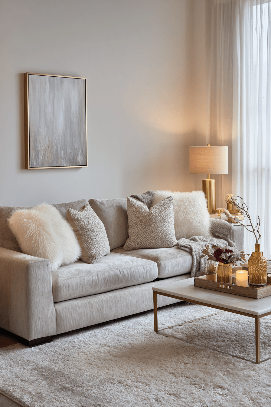 Muted metallic finishes add subtle shine to an elegant living room design with a refined touch. Soft golds and silvers reflect light gently. Mixing finishes adds depth. Warm lighting enhances the effect. The design feels modern and polished. Add metallic accents thoughtfully.