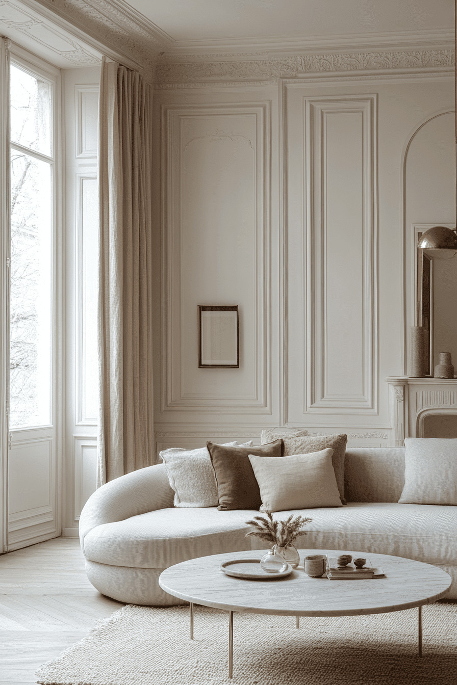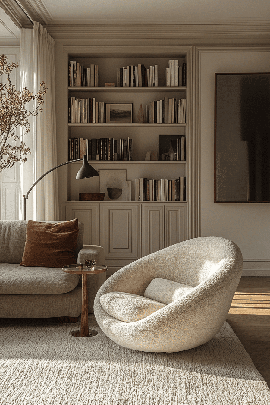 Curved forms soften an elegant living room design by adding movement and balance. Rounded furniture contrasts with sharp edges. Soft lighting enhances depth. The mix feels modern and layered. The space feels inviting and elegant. Introduce curves for flow.