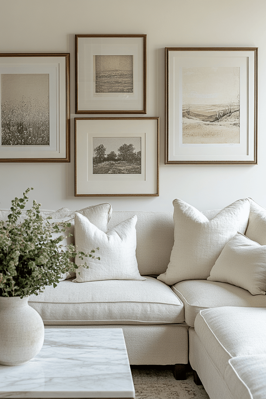 A curated art display enhances an elegant living room design with personality and balance. Coordinated frames keep everything cohesive. Larger pieces anchor the design. Spacing maintains a clean look. Neutral walls highlight the artwork. Style your walls with intention.