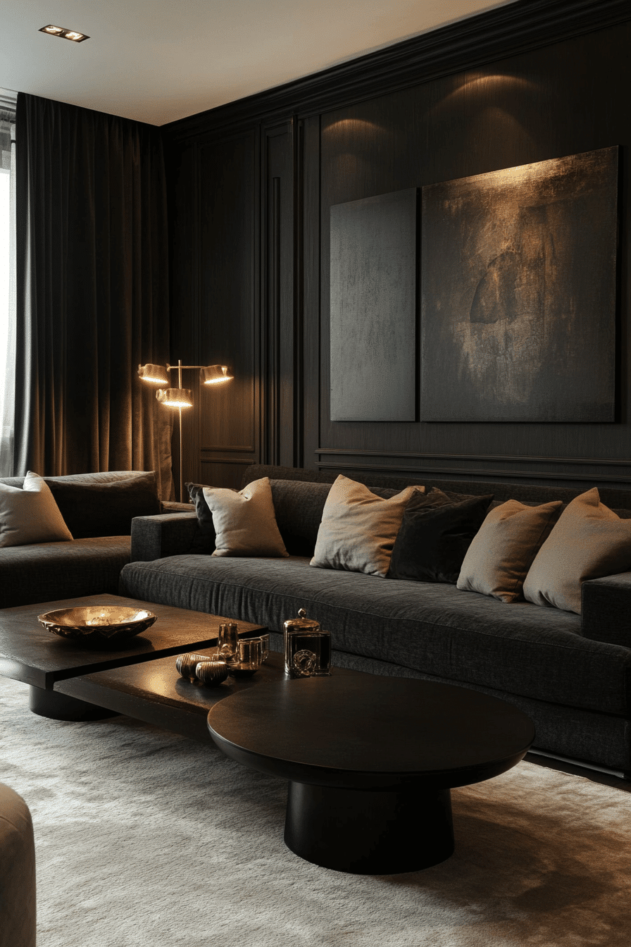 Warm metallic accents introduce a refined glow into an elegant living room design without feeling excessive. Soft gold or bronze finishes reflect light gently across the room. These touches pair beautifully with neutral and dark palettes. Keeping them subtle maintains a clean aesthetic. The result feels polished and inviting. Add warmth through metallic detail.