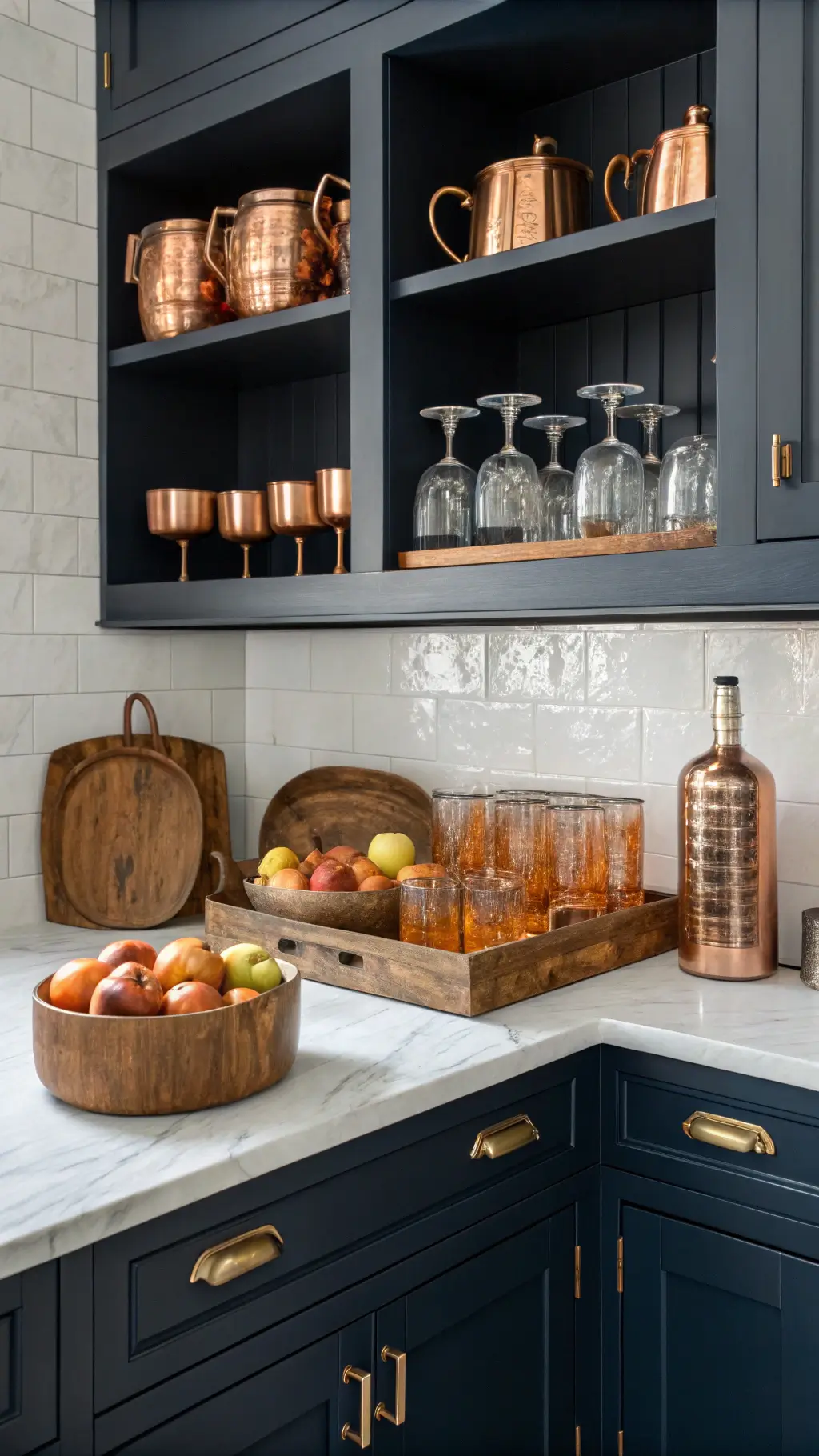 Dusk view of modern farmhouse kitchen featuring a marble island, white shiplap backsplash, hanging copper pots, and artisanal ceramics with fruits under warm lighting.
