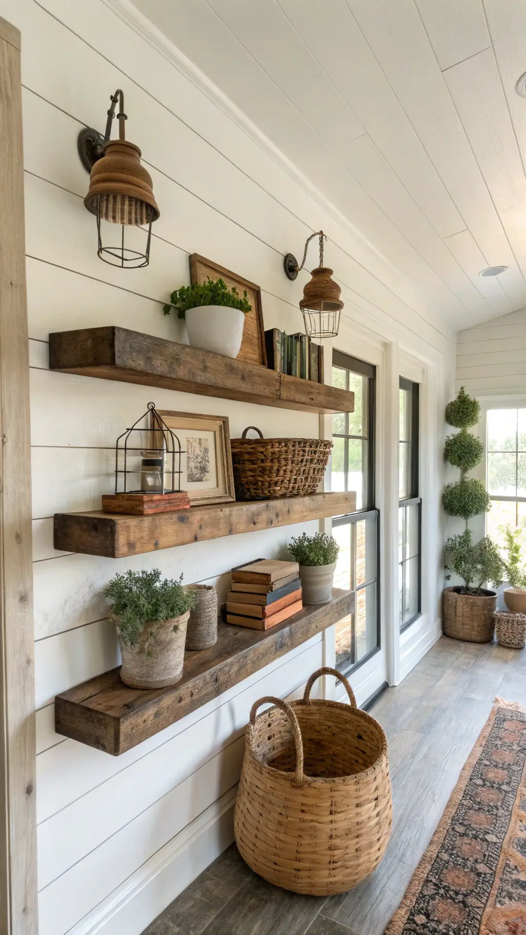 Reclaimed Wood Shelves: The ultimate farmhouse statement.
