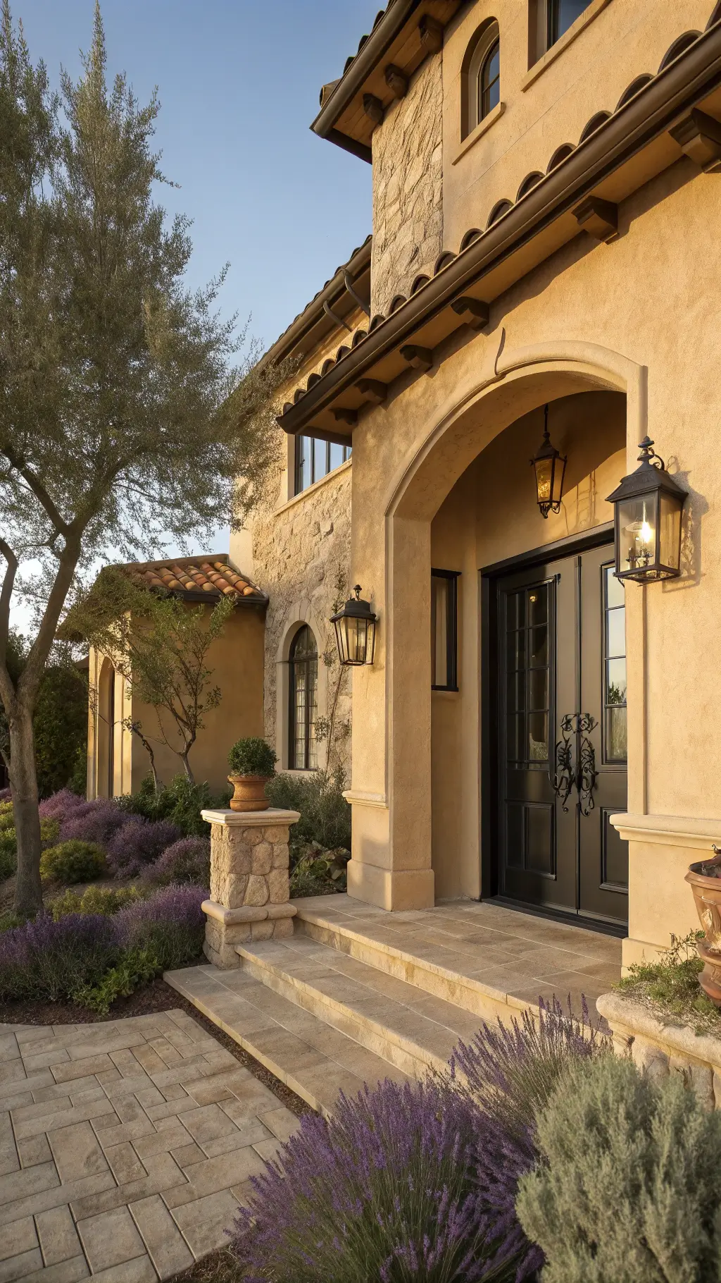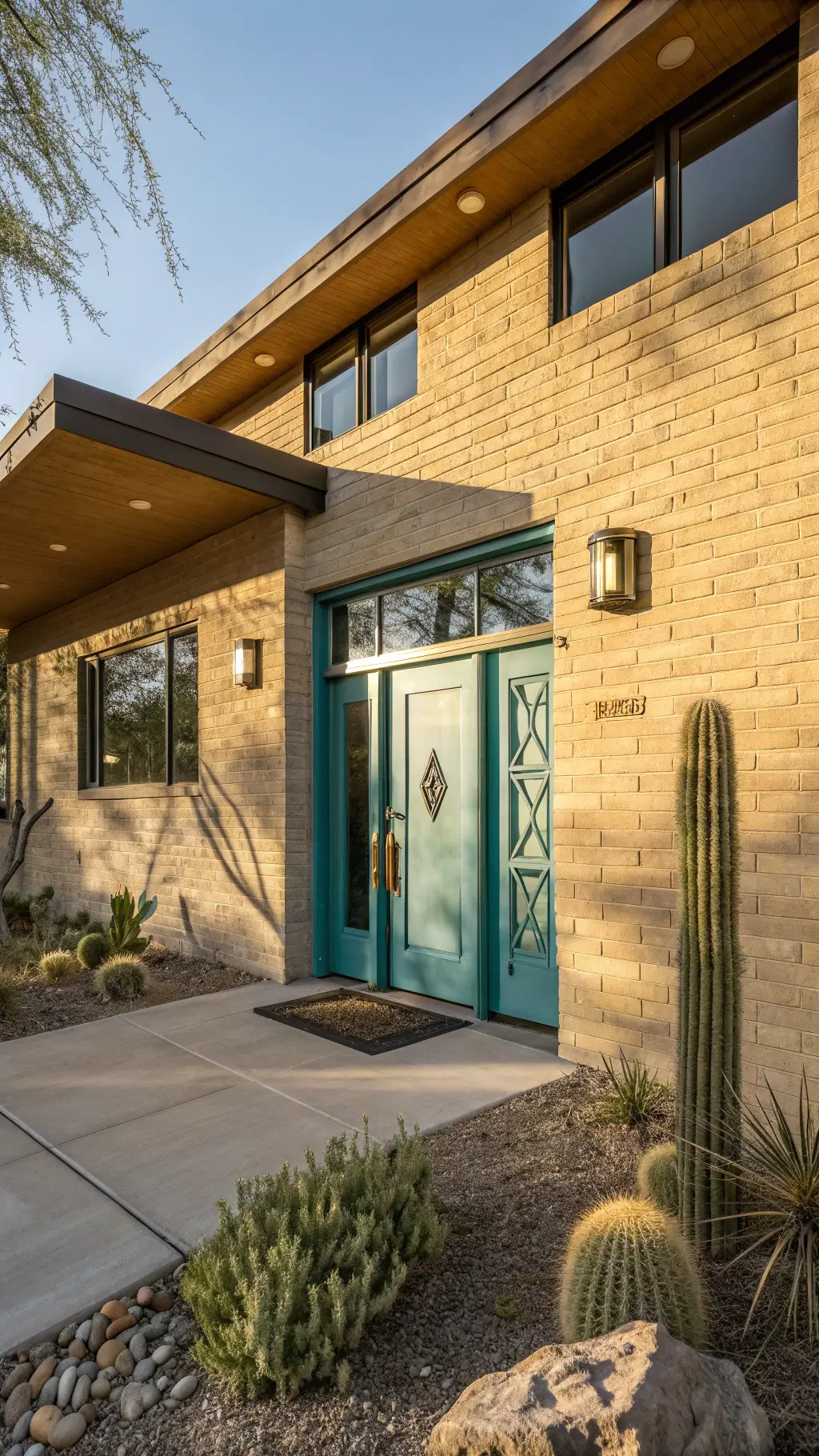- Cool tan exteriors: Complement with blues and grays