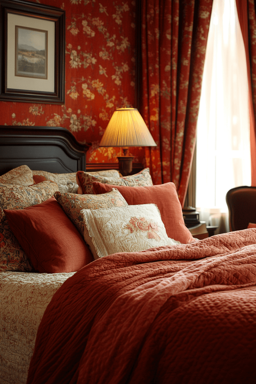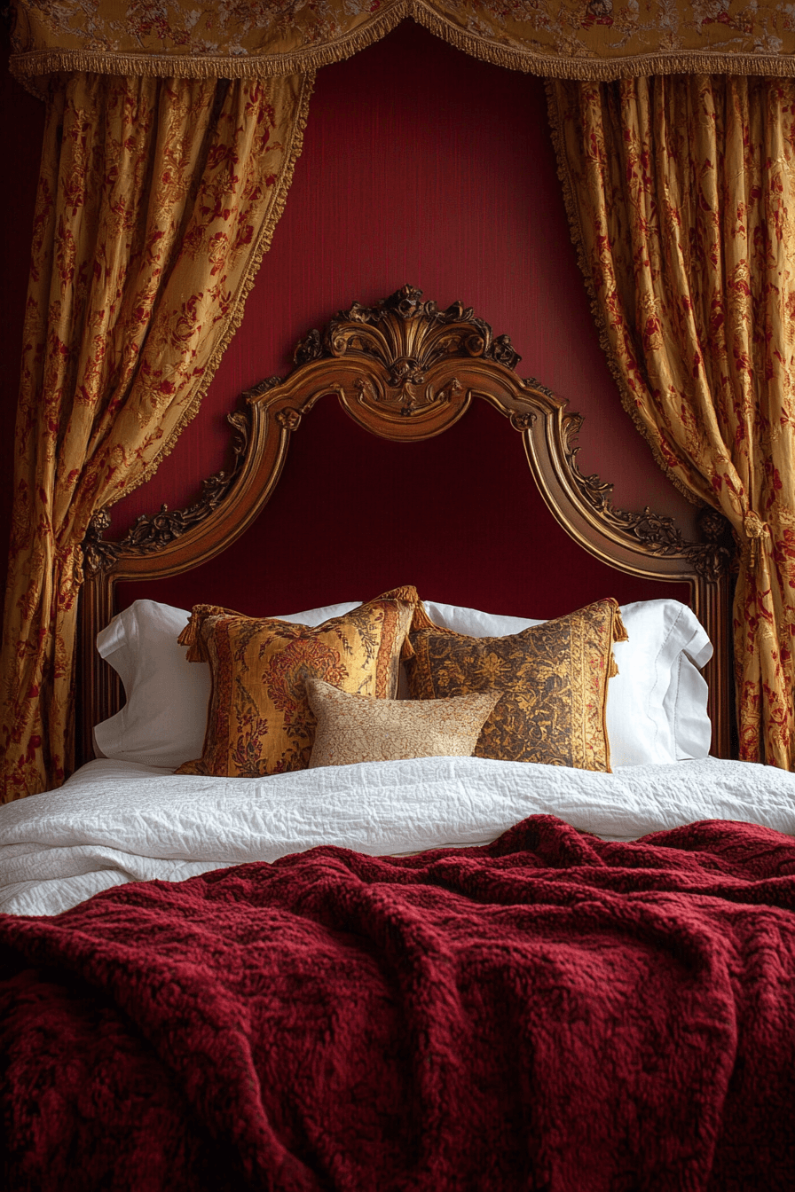 Deep crimson and gold transform guest room ideas into rich, regal retreats. Velvet textiles and dramatic accents add royal depth. The palette feels indulgent and bold. It’s elegance fit for a modern palace.