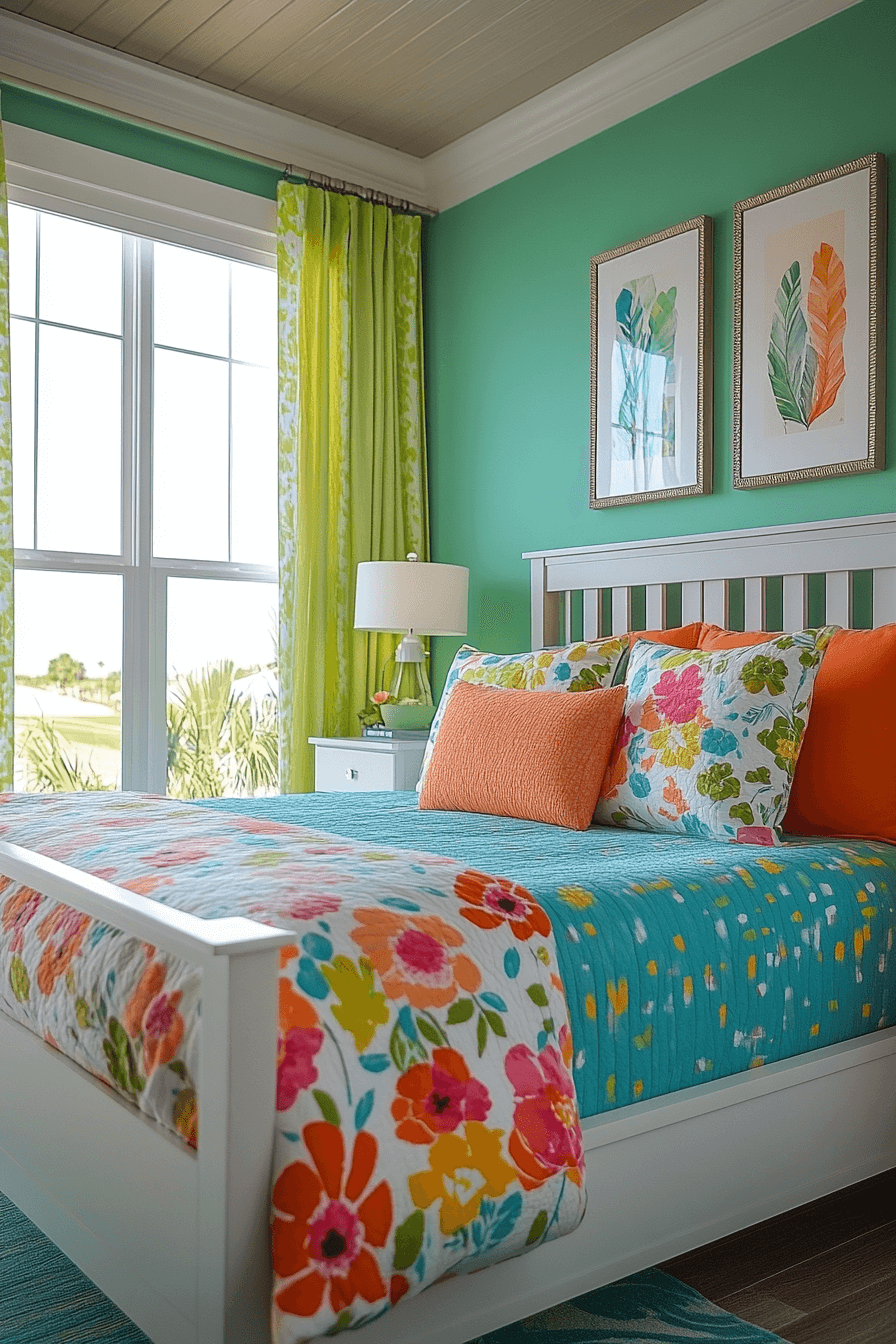 Bright, happy, and full of life, colorful guest room ideas spark instant joy. Bold prints, contrasting pillows, and vibrant decor energize the entire space. It’s playful yet sophisticated. Perfect for creative spirits.