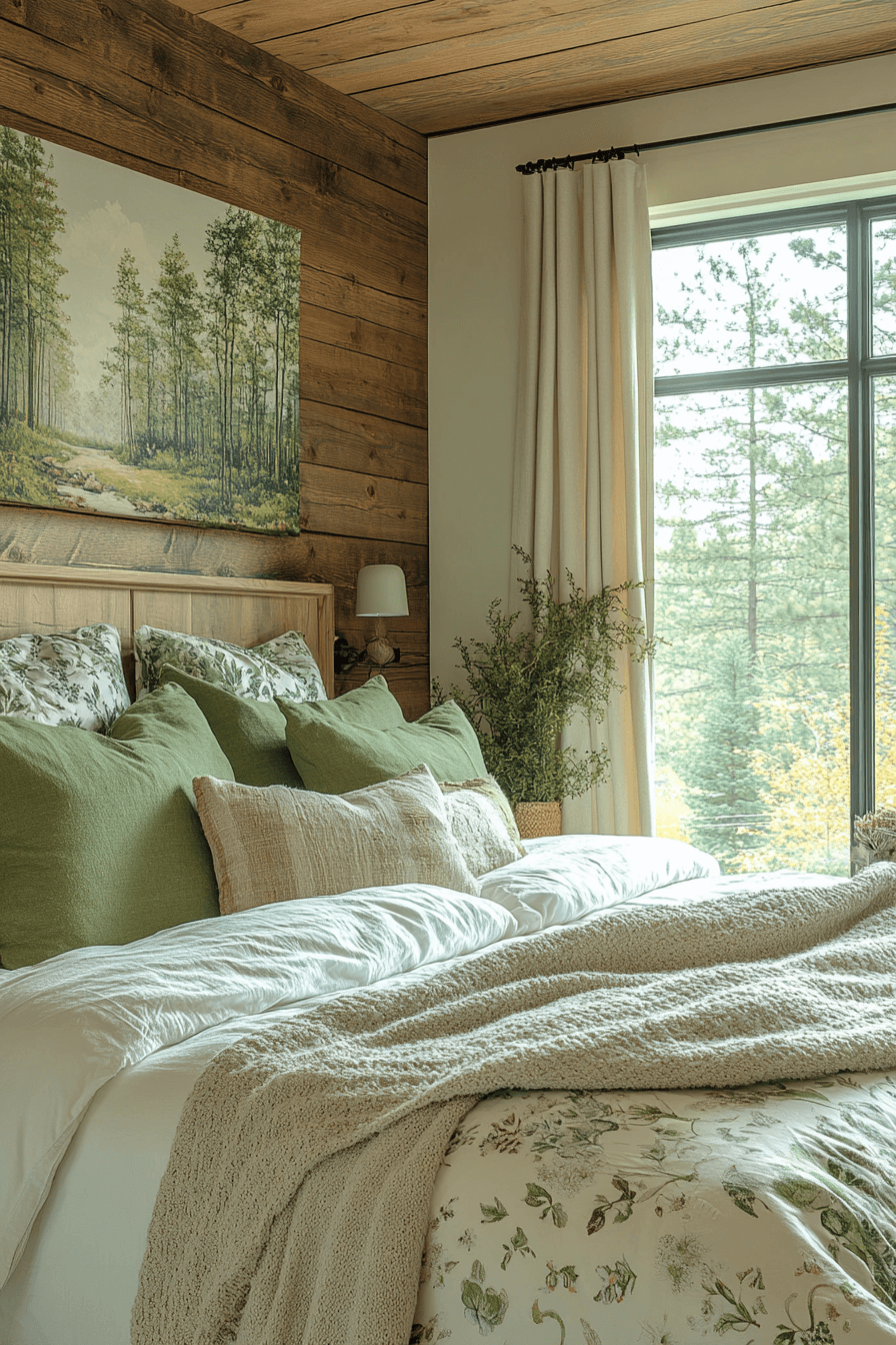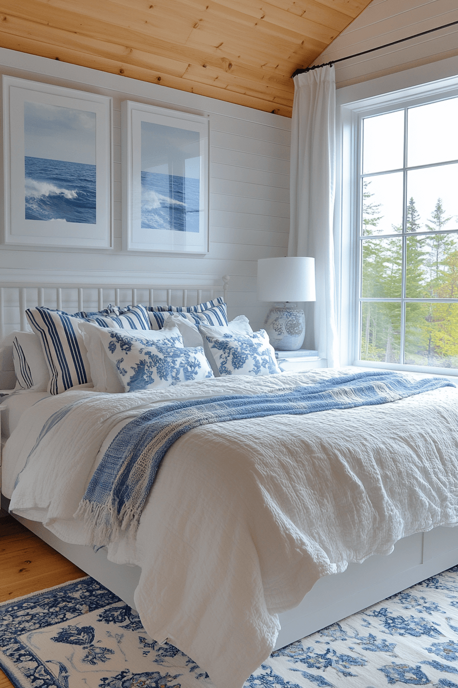 Serene and reflective, lakeside guest room ideas mirror nature’s calm beauty. Cool neutrals and gentle patterns keep the space peaceful and airy. Natural wood tones add depth and comfort. It’s the perfect balance of simplicity and warmth.