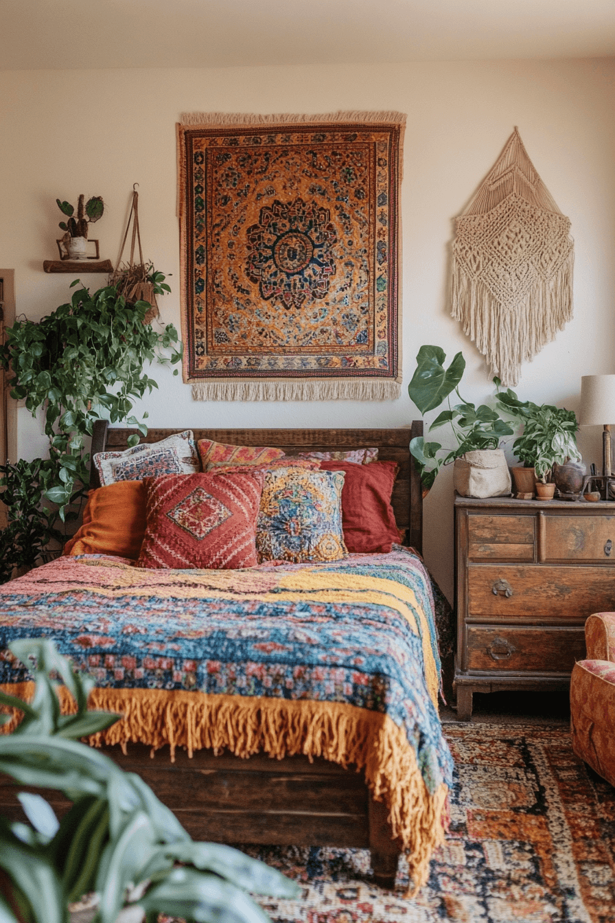 Create a carefree haven full of texture and charm with bohemian-inspired guest room ideas. Think woven rugs, rattan furniture, and pillows bursting with color and pattern. Macramé wall hangings and warm lighting add a touch of wanderlust. The atmosphere feels joyful and relaxed.