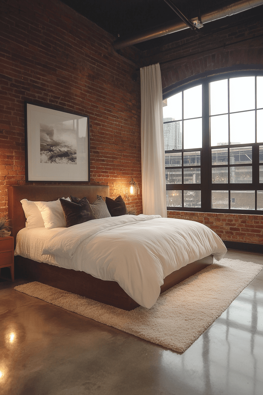 Raw texture meets modern elegance in loft-style guest room ideas. Exposed beams and brick pair beautifully with velvet cushions and gold accents. The space feels bold yet balanced. Industrial charm meets comfort.