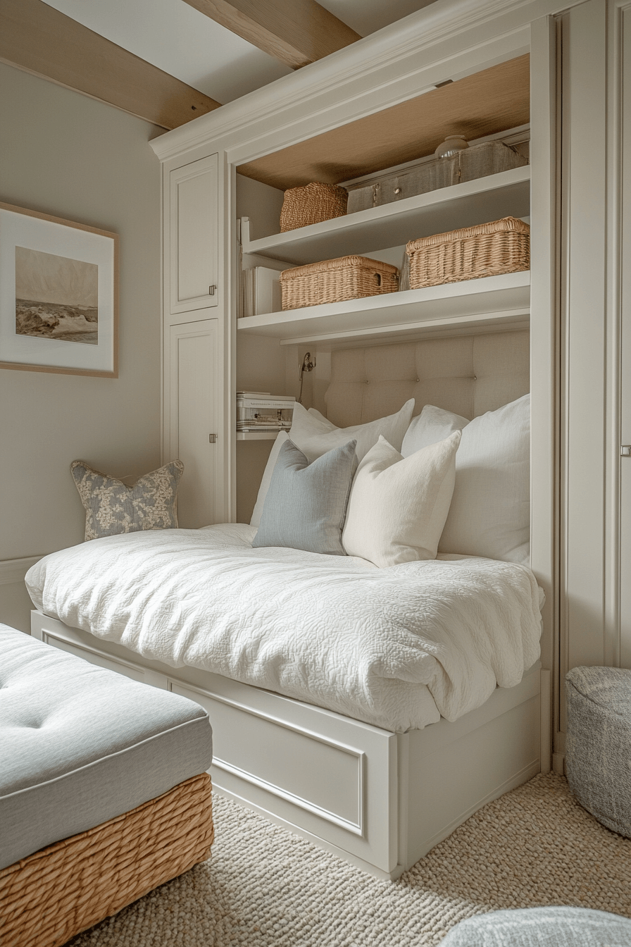 These coastal guest room ideas channel easy seaside energy with their breezy colors and textures. Think driftwood finishes, linen fabrics, and soft sea-glass tones. Every breeze feels like vacation air. Natural light enhances the calm aesthetic.