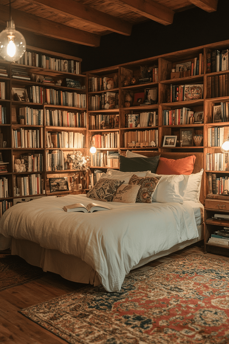 Library-inspired guest room ideas blend comfort with culture in perfect balance. Shelves lined with books create an intellectual yet inviting atmosphere. Warm lighting softens every edge. The result is cozy sophistication.