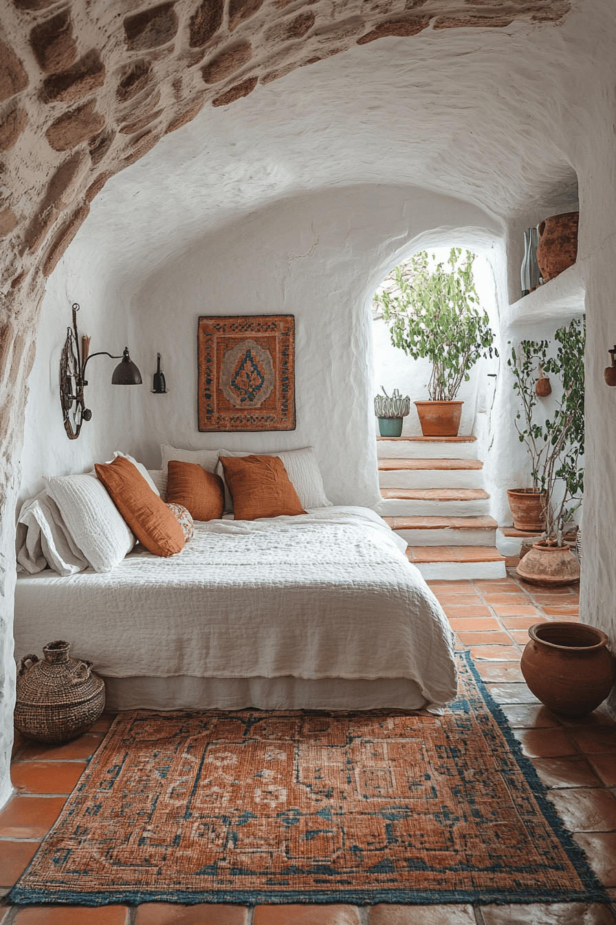 Mediterranean guest room ideas fill your home with sunny character and timeless elegance. Terracotta tiles, textured walls, and sky-blue accents transport guests seaside. The warmth feels endless and golden. Every detail breathes relaxed luxury.