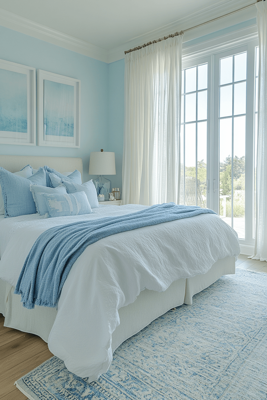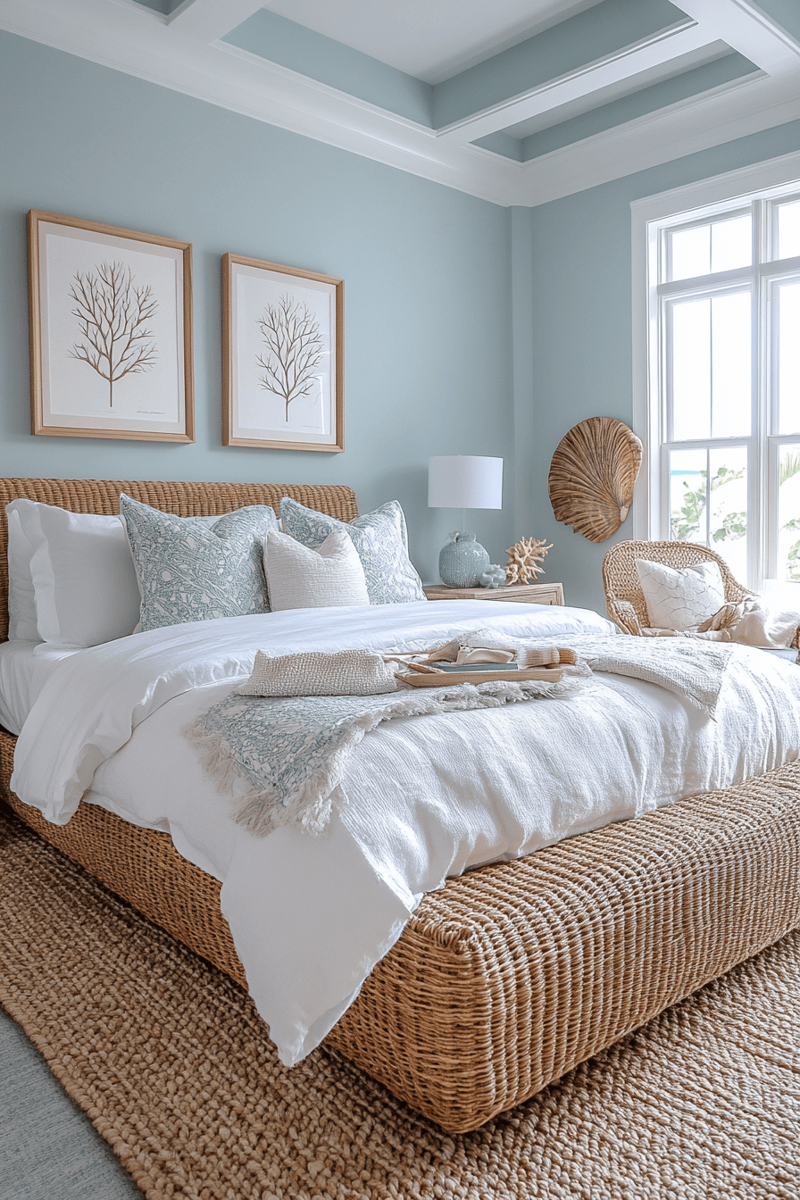 Coastal serenity flows through every detail of these beach-inspired guest room ideas. Pale blues, sandy tones, and breezy linens set a scene of ocean-kissed calm. Nautical artwork and driftwood touches keep it authentic yet modern. The space feels as refreshing as a sea breeze.