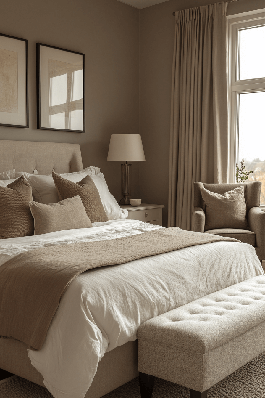 Glowing amber and golden accents turn warm-toned guest room ideas into a cozy cocoon. Soft lighting reflects against plush textures for an irresistible glow. Natural wood adds depth and balance. Every inch feels inviting.
