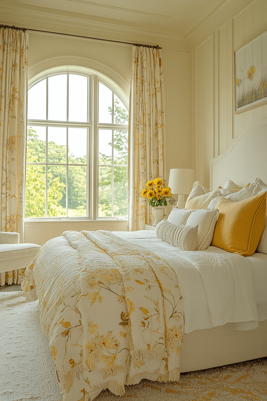 Golden-toned guest room ideas celebrate brightness and warmth. Light walls and reflective accents enhance natural light. Cheerful details add charm. The space feels uplifting and open. Mornings feel brighter here.