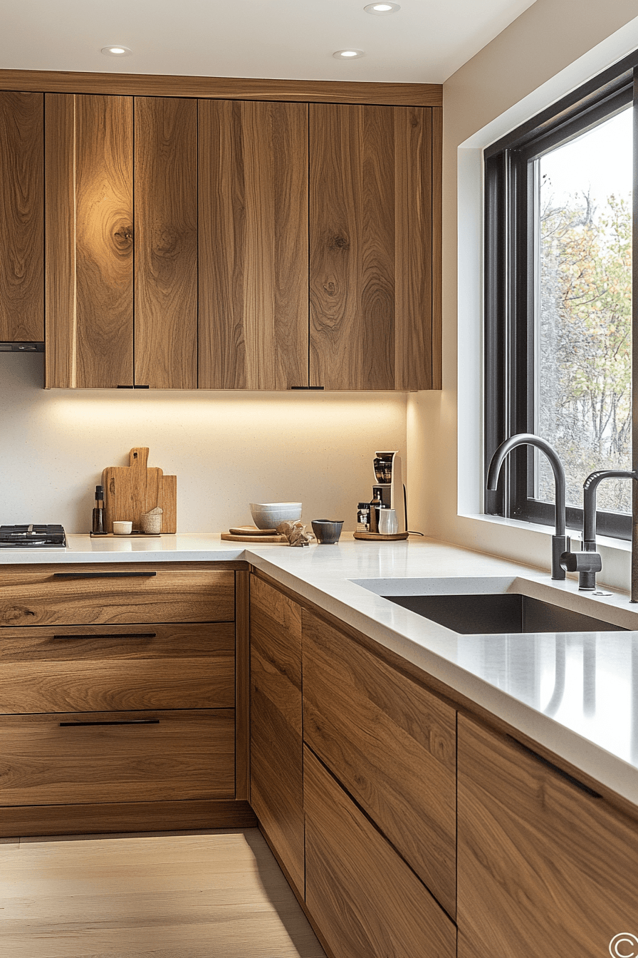 Modern flat surfaces give hickory kitchen cabinets a sleek and contemporary feel. The uninterrupted grain becomes the main design feature. Hickory kitchen cabinets pair beautifully with streamlined appliances. The overall look feels minimal yet warm. The space stays visually clean and inviting. Update your kitchen with this sleek style.