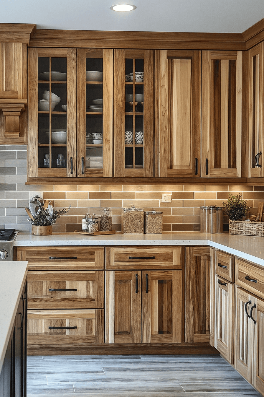 Smooth stone surfaces complement hickory kitchen cabinets with a polished and balanced look. The contrast between sleek materials and textured wood creates visual harmony. Hickory kitchen cabinets stand out beautifully against lighter countertops. This pairing is both durable and stylish. It works across multiple kitchen styles. Combine textures to elevate your kitchen design.