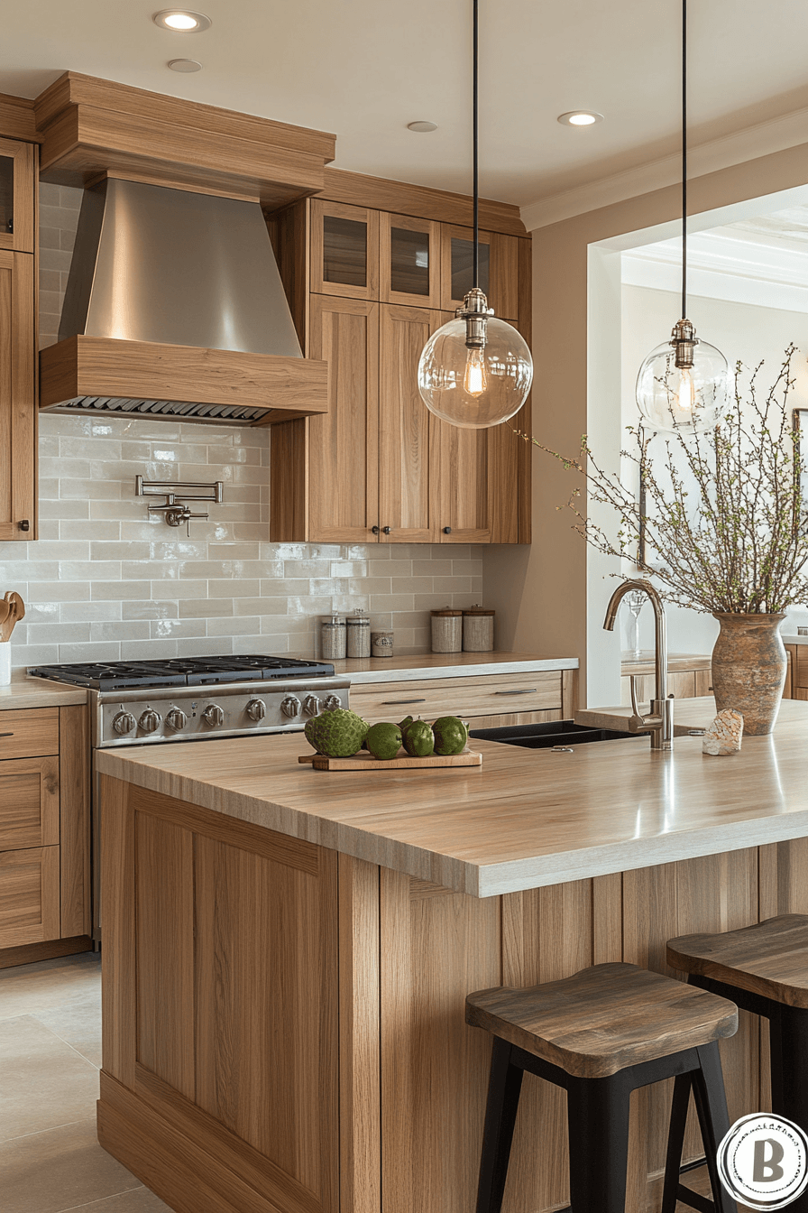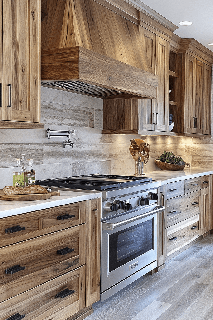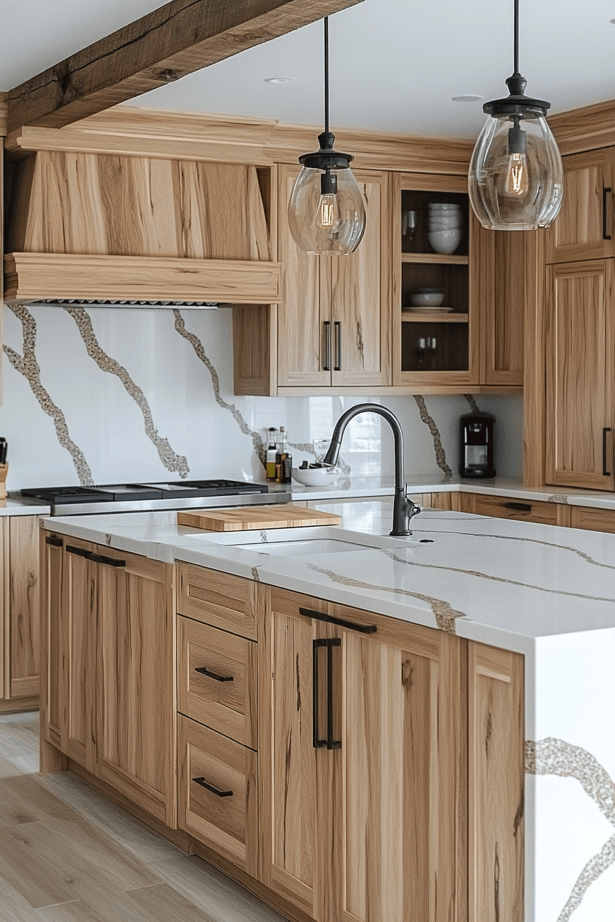 Combining wood tones with hickory kitchen cabinets adds depth and layered interest. Mixing finishes creates a curated and stylish look. Hickory kitchen cabinets act as a strong foundation. The design feels dynamic without being overwhelming. The space feels rich and balanced. Mix wood tones for a designer-inspired kitchen.