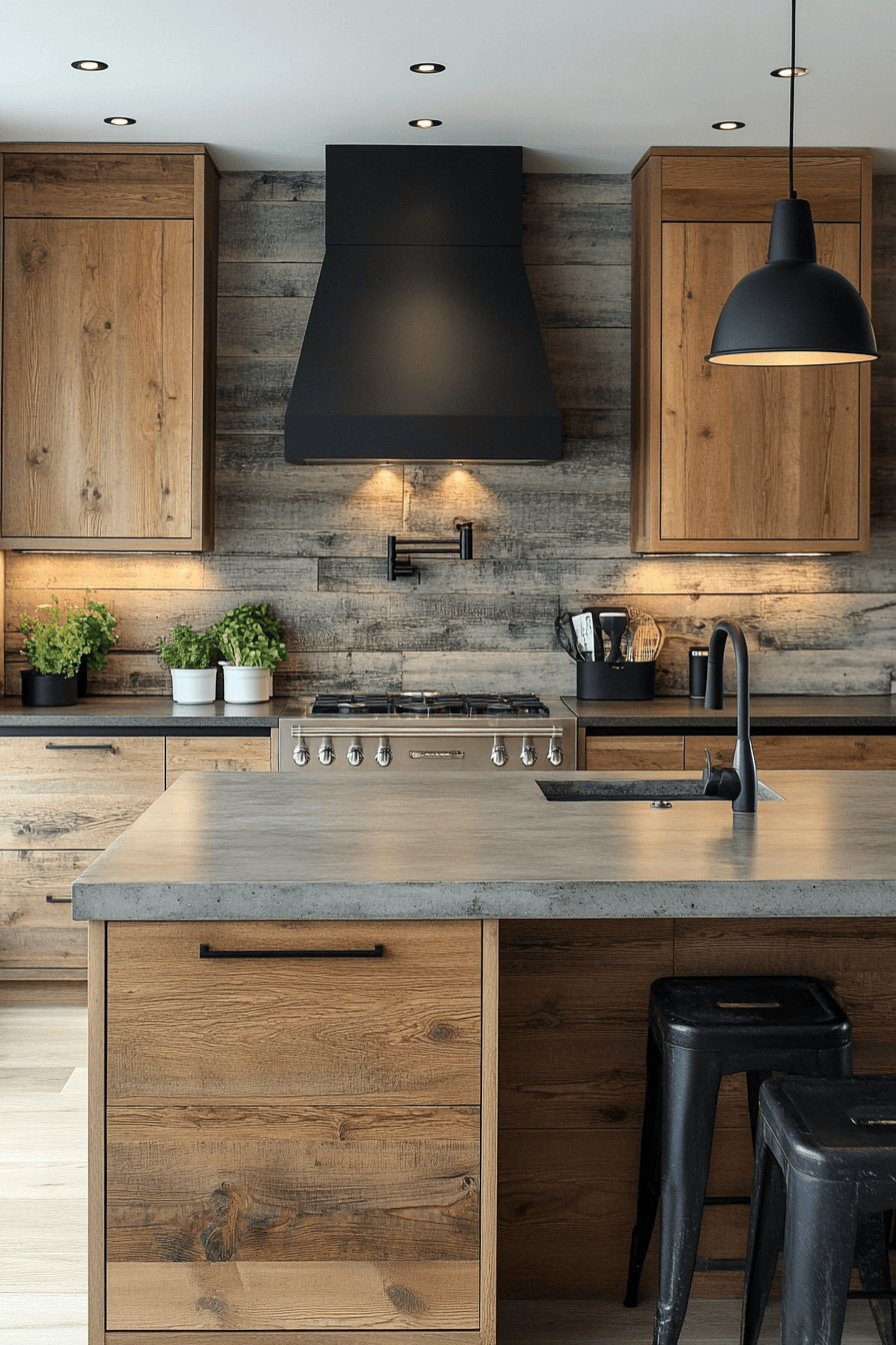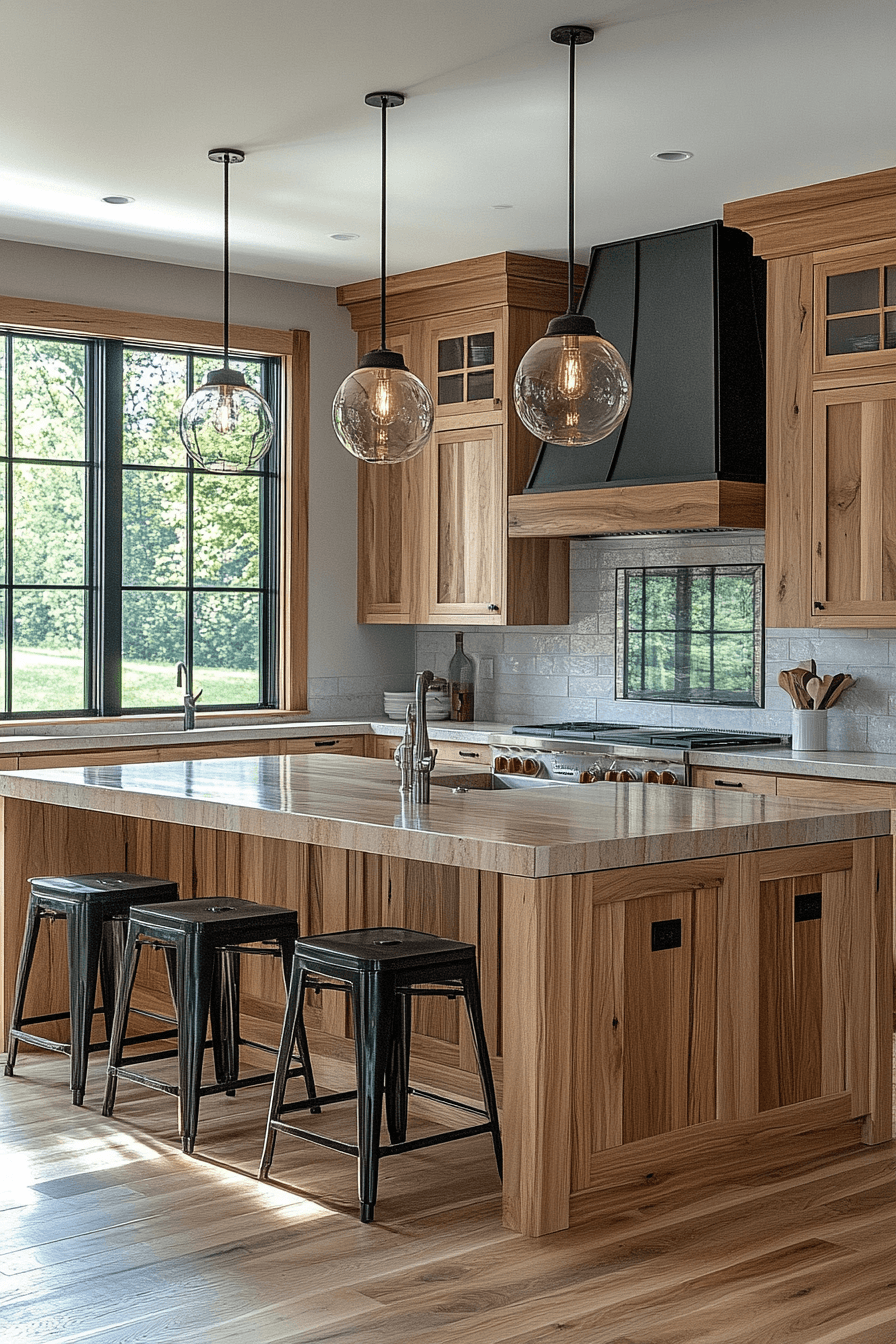 Blending modern and rustic elements with hickory kitchen cabinets creates a fresh and balanced design. Clean lines keep things current while wood adds warmth. Hickory kitchen cabinets anchor the space beautifully. The contrast feels natural and intentional. The space feels inviting and stylish. Combine styles for a modern rustic look.