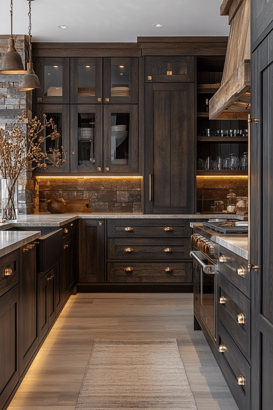 Rich darker hues give hickory kitchen cabinets a bold presence that feels dramatic and sophisticated. The deep stain highlights the natural texture while adding depth. Hickory kitchen cabinets in darker finishes pair well with sleek surfaces and metallic details. The contrast creates a refined look. The overall design feels elevated and full of character. Add depth and drama to your kitchen.