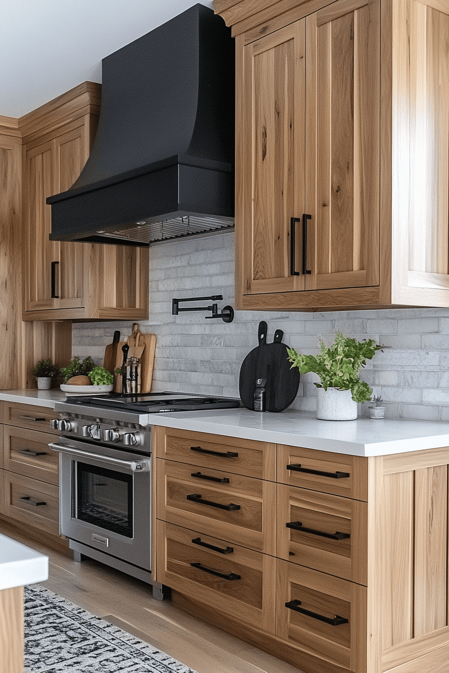 High-contrast styling with dark accents enhances hickory kitchen cabinets with a modern edge. Black fixtures and hardware create a striking visual against the warm wood. Hickory kitchen cabinets maintain their natural appeal while feeling more contemporary. The balance between tones keeps the design sharp. The space feels bold and intentional. Introduce contrast to sharpen your kitchen style.