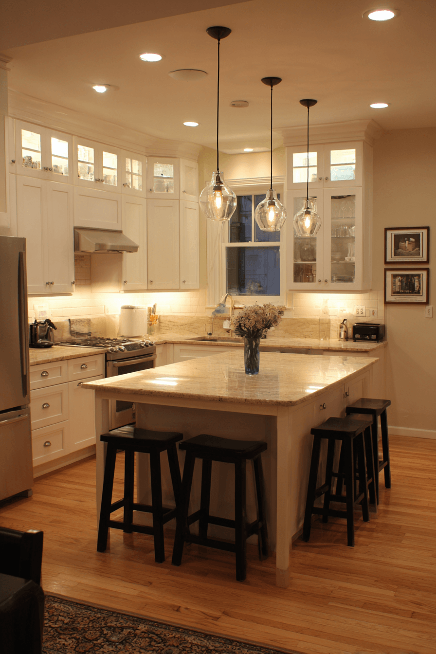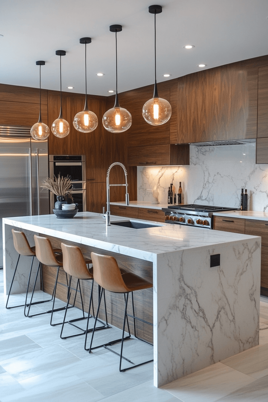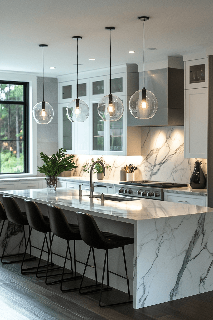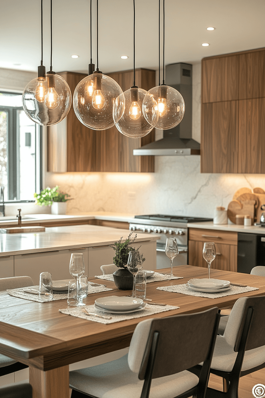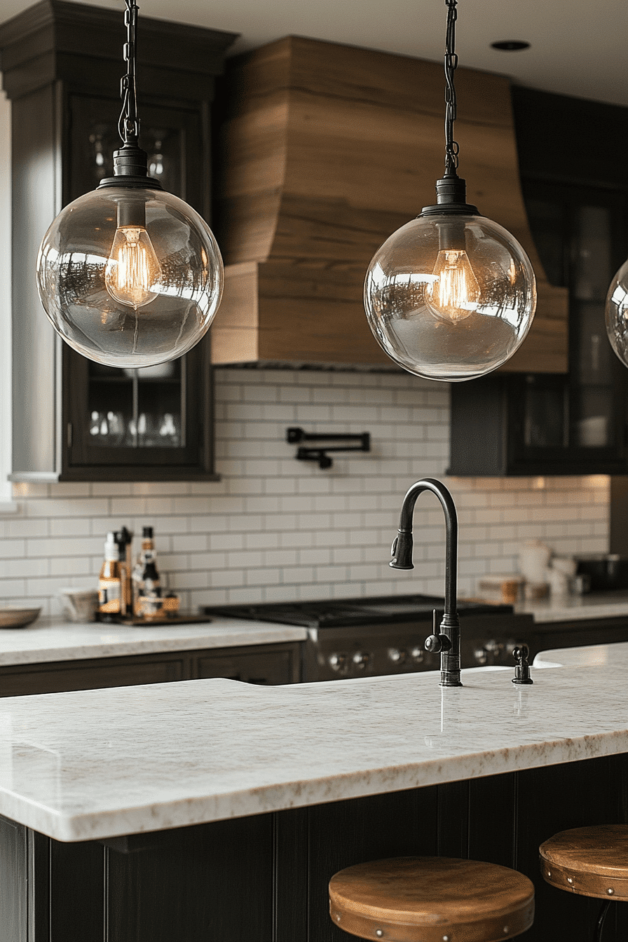 Rounded globe lights add personality while maintaining a clean and timeless look. Even light distribution creates a welcoming atmosphere. Kitchen lighting ideas like this feel playful yet polished. Single fixtures or clusters both work well. The design feels unique without overpowering. Add character with globe lighting.