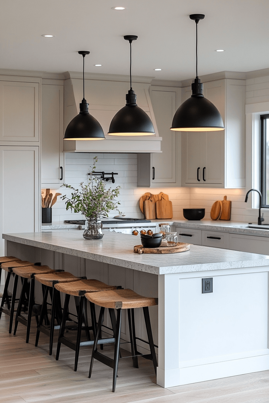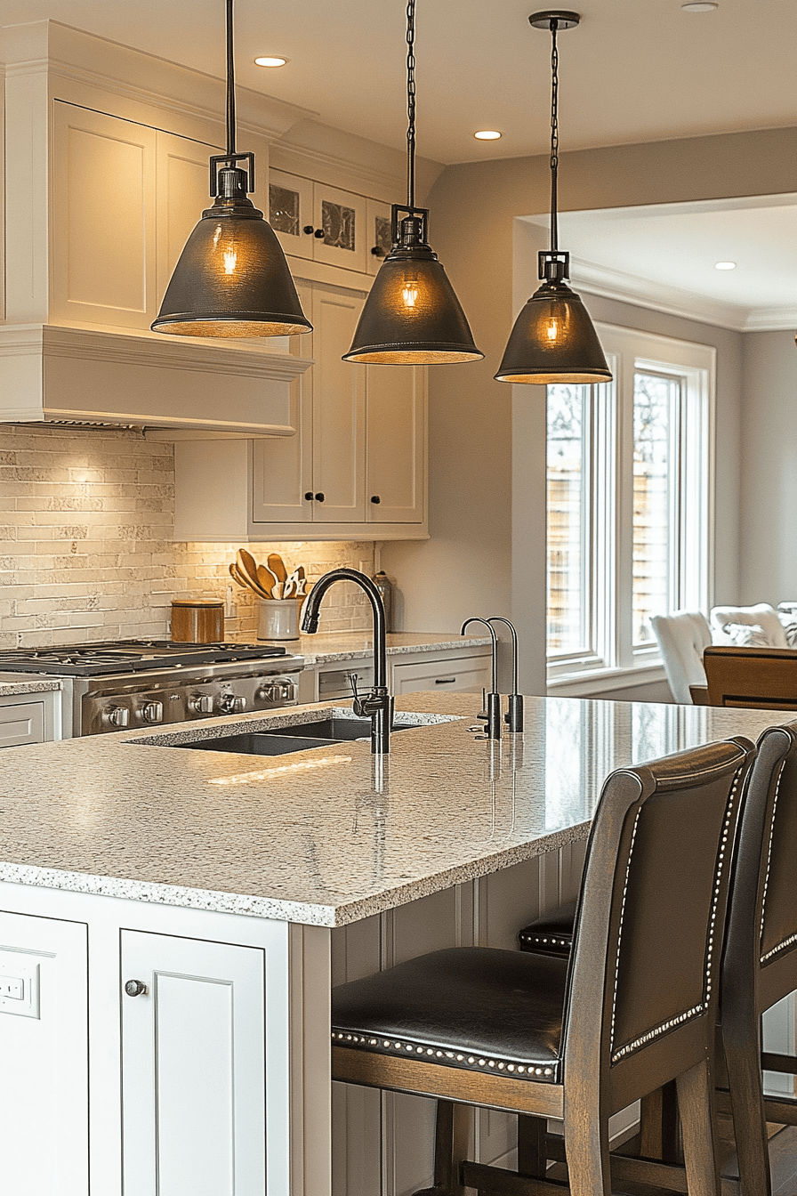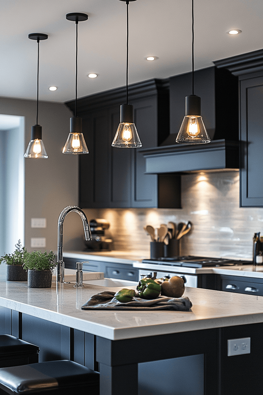 Dark-toned fixtures create contrast and visual interest within the space. Bold finishes stand out against lighter surfaces. Kitchen lighting ideas featuring black elements add definition and style. The design feels modern and grounded. Coordinating hardware enhances the look. Add contrast that sharpens your design.
