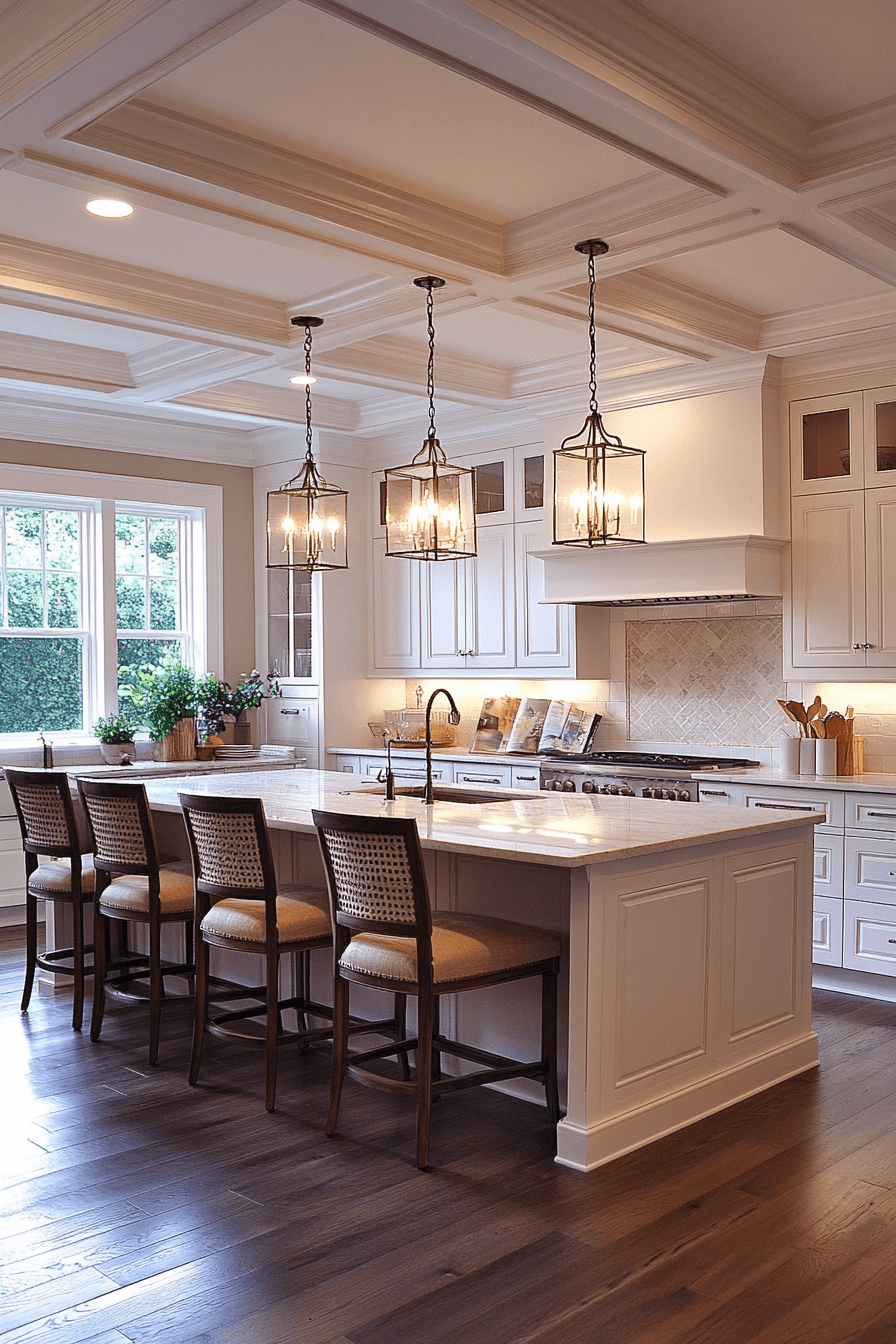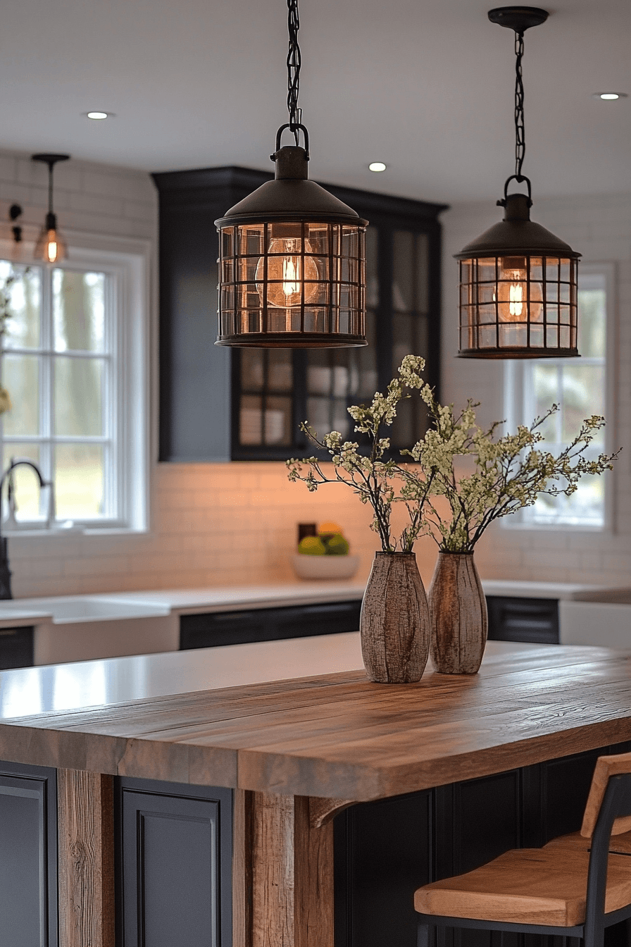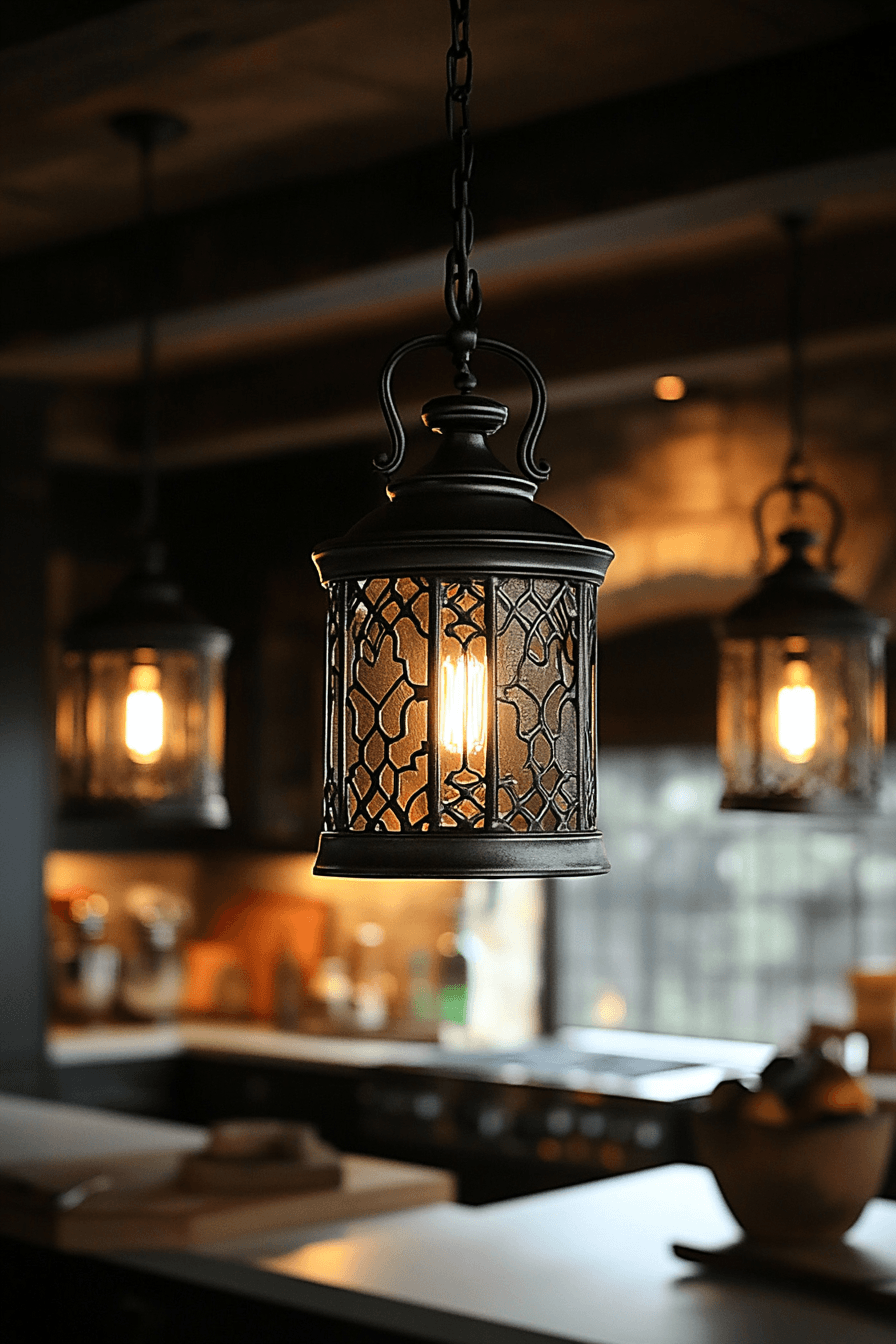 Rustic lantern fixtures bring warmth and character into the kitchen with their textured materials. Soft light creates a welcoming and cozy atmosphere. Kitchen lighting ideas like this suit farmhouse or traditional styles beautifully. Wood and metal finishes add depth. The room feels relaxed and inviting. Introduce rustic charm into your space.