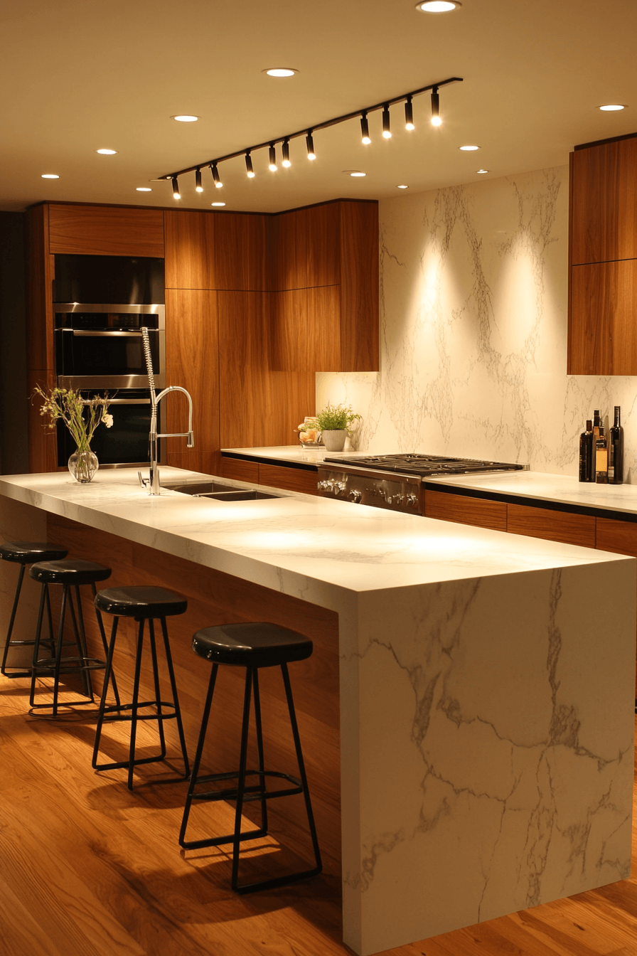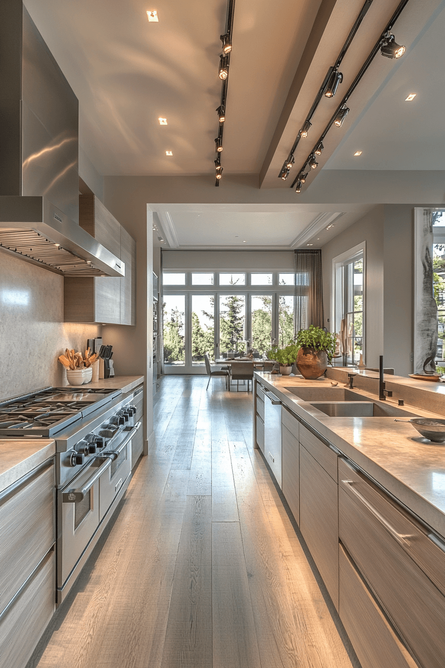 Track lighting systems provide adjustable coverage that adapts to changing needs. Individual heads can be repositioned for different zones. Kitchen lighting ideas like this work well in open layouts. The design stays sleek and flexible. The space feels modern and practical. Customize your lighting setup with track systems.