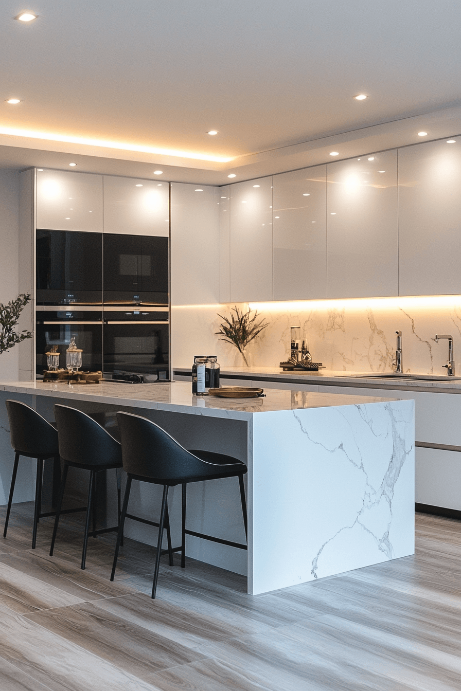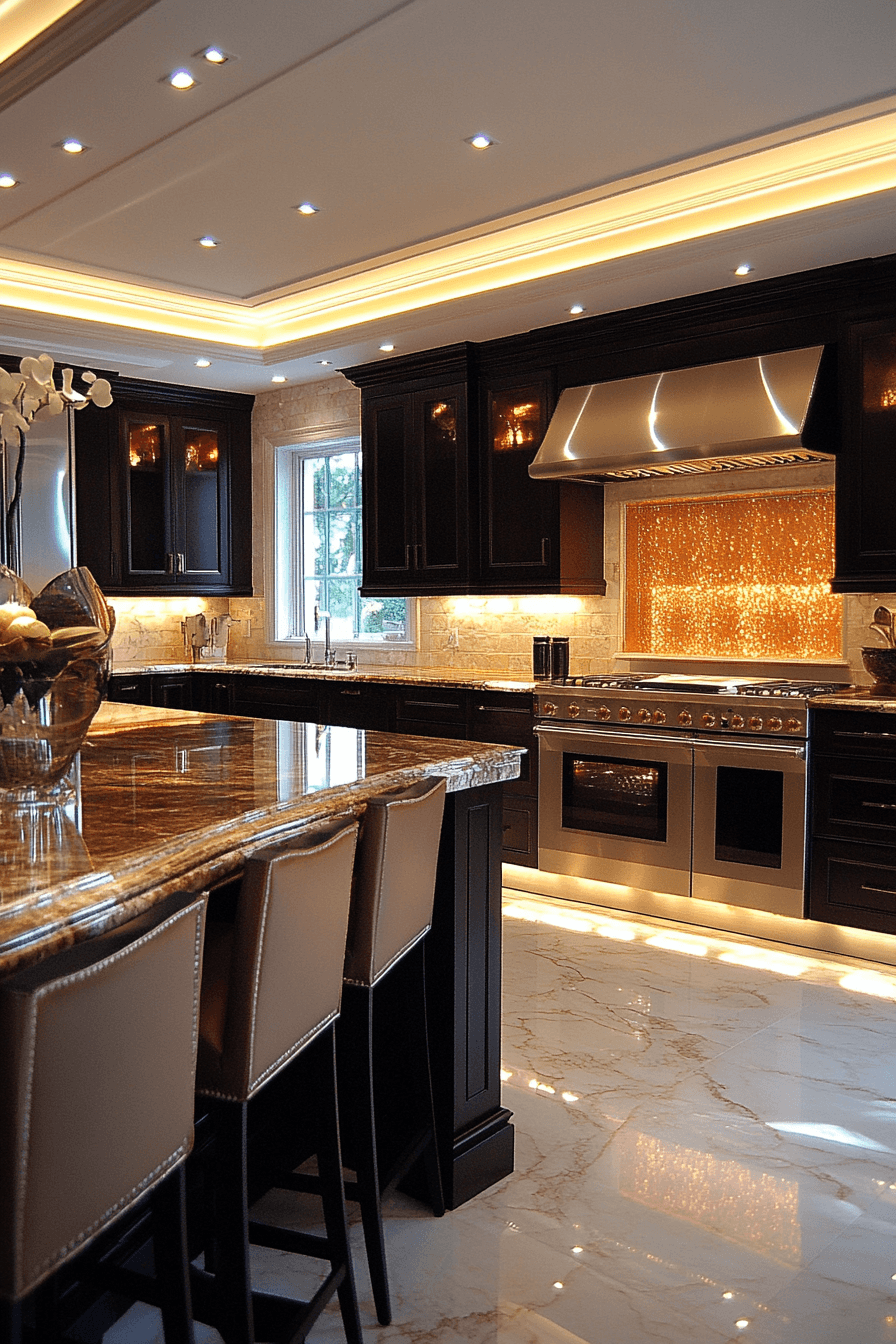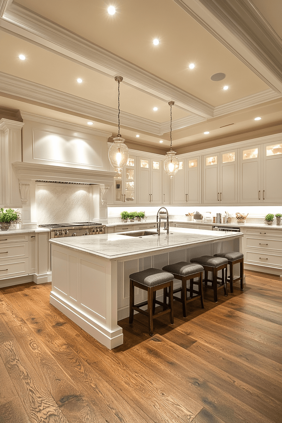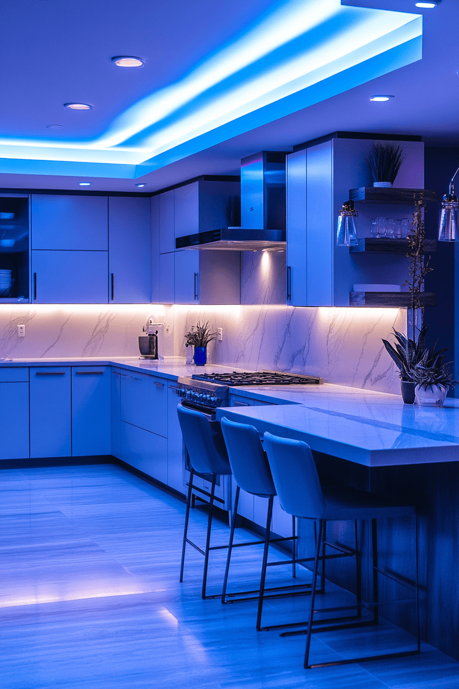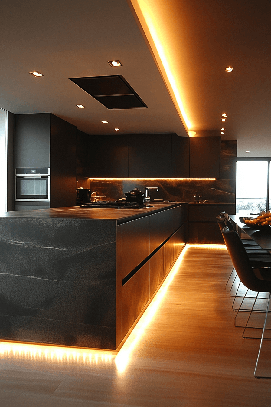 Indirect cove lighting spreads a soft glow that enhances the overall ambiance of the kitchen. Light reflects gently across ceilings or walls. Kitchen lighting ideas like this make the space feel larger and more refined. The mood becomes calm and polished. Subtle illumination adds a sense of luxury. Create a soft ambient effect in your kitchen.